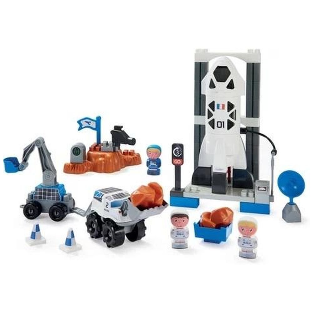 Baza kosmiczna z promem kosmicznym i platformą startową oraz łazikiem z naczepa do badania znalezisk kosmicznych.