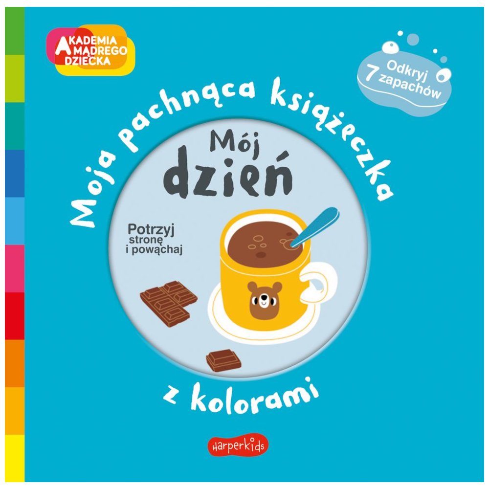 Książeczka uczy kolorów, pokazuje przedmioty w danej brawie, a dodatkowo każda prawa strona po potarciu obrazka pachnie. W Moim dniu mamy zapachy: świerku, truskawki, lodów waniliowych, pieczonego kurczaka, mydła i perfum lawendowych.