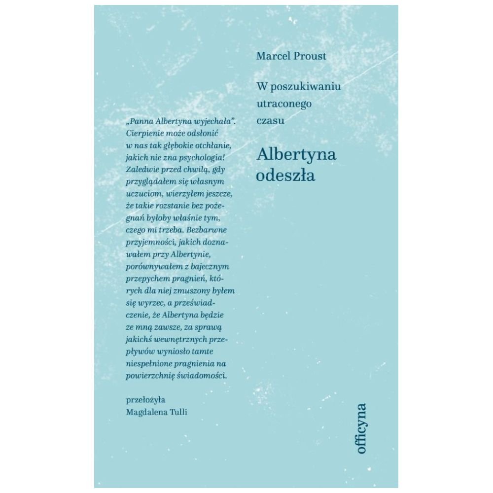 Albertyna odeszła Główną oznaką tego, że Proust nie zdążył dokończyć pracy nad szóstym tomem, jest po prostu nieobecność finału. Gdy spodziewamy się zapowiedzianego parę stron wcześniej wyjazdu narratora w okolicę, w której w pierwszym tomie zaczynała się cała historia, opowieść urywa się nagle w przypadkowym miejscu. W rękopisach Prousta odnaleziono fragment z opowieścią o tym wyjeździe, został więc wklejony jako zakończenie. Ale i w nim brakuje ostatecznej puenty. Jak autor chciał to zakończyć, nigdy się nie dowiemy – z tą myślą mieliśmy pozostać.