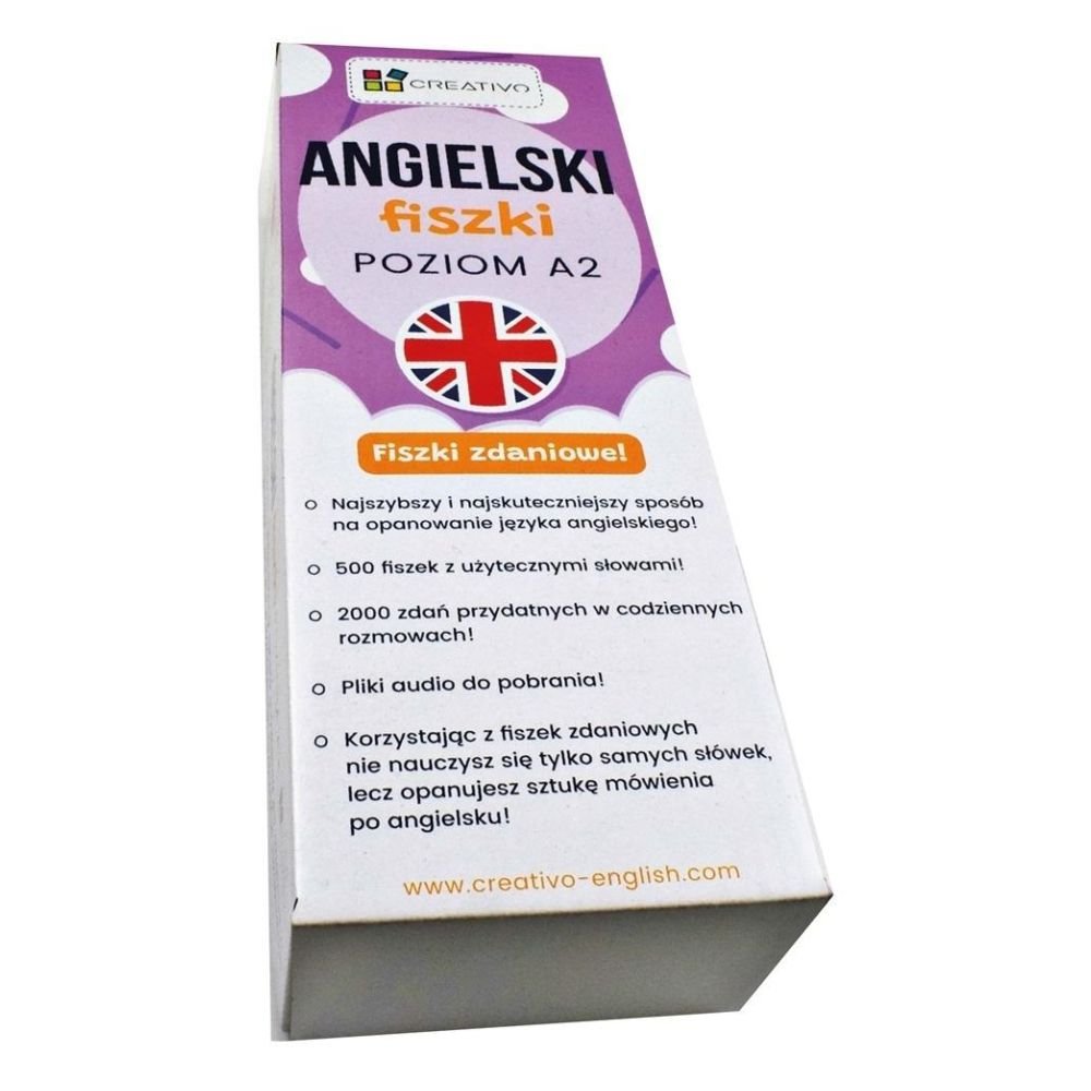 Zestaw składa się z 500 fiszek, około 2000 zdań na poziomie A2 oraz plików audio do pobrania na stronie wydawnictwa CREATIVO.