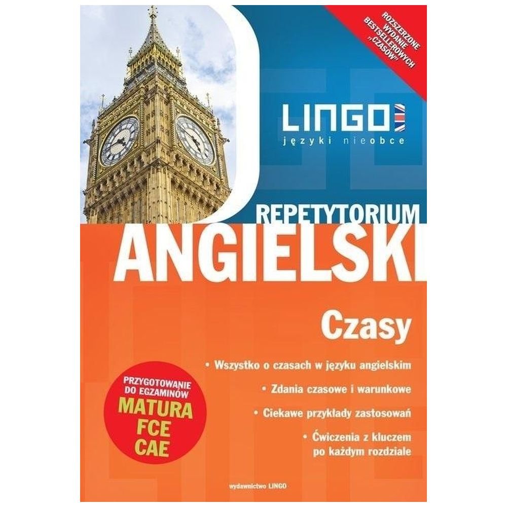 Najnowsze wydanie najpopularniejszej na rynku powtórki z angielskich czasów. Książka należy do znanej serii repetytoriów językowych Lingo. Przeznaczona jest dla uczniów, maturzystów, studentów, osób przygotowujących się do egzaminów językowych, a także wszystkich, którzy potrzebują uporządkowania i poszerzenia wiadomości o czasach angielskich. Publikacja uwzględnia materiał wymagany na maturze oraz egzaminach takich jak First Certificate in English czy Certificate in Advanced English.