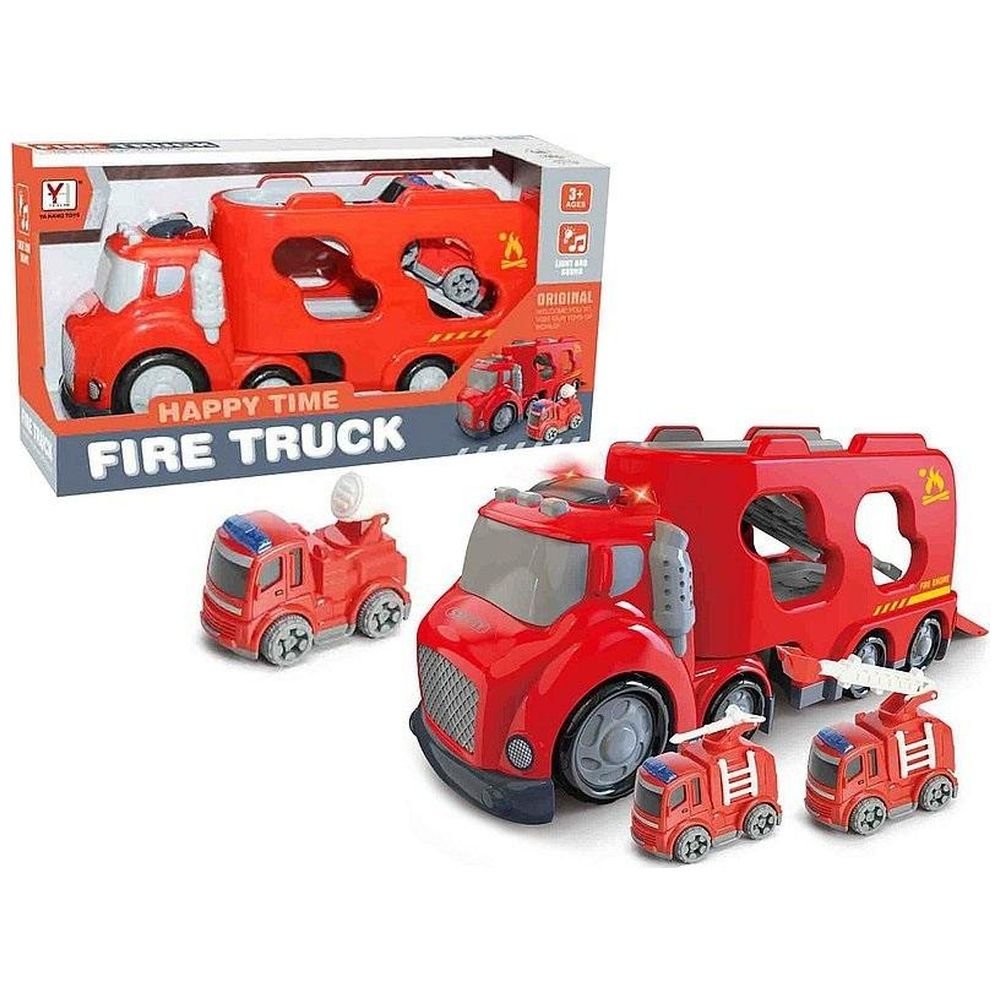 auto z kontenerem i 2 autkami straży pożarnej, światło, dźwięk; 30×10,5x16cm, W/B
