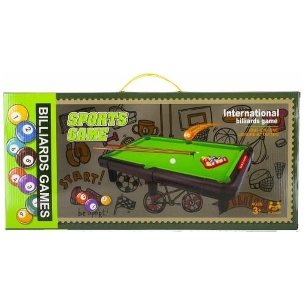 Rozwija kreatywność dziecka, pozwala na spędzenie wolnego czasu. Praktyczne wydanie stołu bilardowego idealnie nadającego się dla mniejszych graczy. Bilard staje się sportem coraz bardziej popularny jako sposób na spędzenie wolnego czasu. Prezentowany stół jest idealnie zeskalowany z profesjonalnych stołów pełnowymiarowych. Zawartość zestawu: stół, 11 bil, 2 x kijki, trójkąt, 6 nóżek do stołu. Całość wykonana z plastiku i zamszu.
