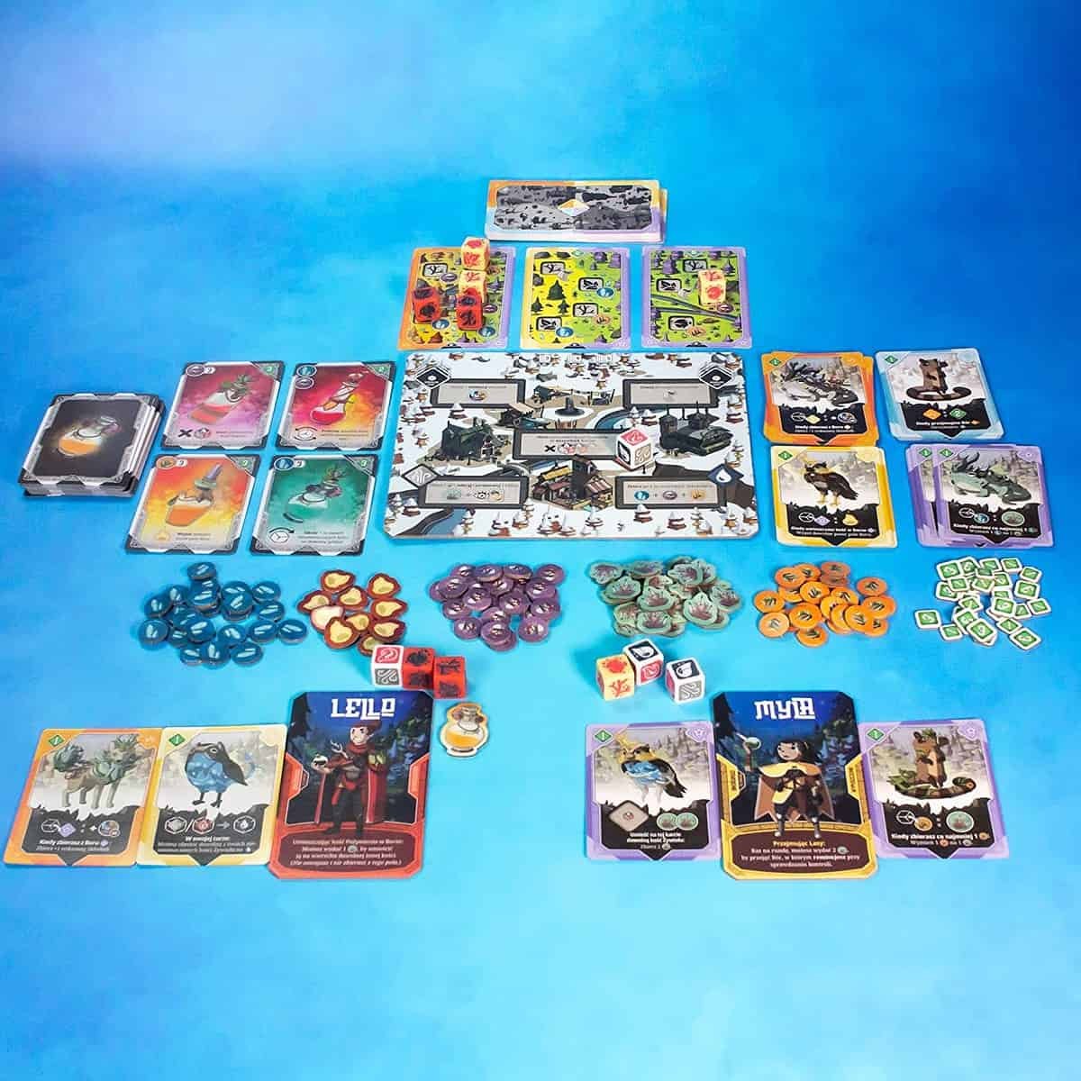 Na początku rozgrywki wybieramy swojego zaklinacza, reprezentującego nas w psotnym lesie. Umieszczamy na środku stołu planszę Wioski – pokazuje ona Dzień i Noc, które zmieniają się co turę, a to z kolei zapewnia nam różne dodatkowe bonusy oraz akcje specjalne. Nad planszą kładziemy karty Boru – znajdziemy na nich składniki potrzebne do tworzenia magicznych napojów. Po prawej stronie wioski należy przygotować cztery stosy kart Stworzeń. Następnie rozdajemy każdemu z graczy sześć kości, w których skład wchodzą cztery Pożywienia i dwie Żywiołu. Te pierwsze odpowiadają kolorystycznie naszym zaklinaczom, dlatego łatwo będzie wam je rozpoznać. W pierwszej rundzie możecie nie rozpatrywać efektów specjalnych waszych bohaterów.
