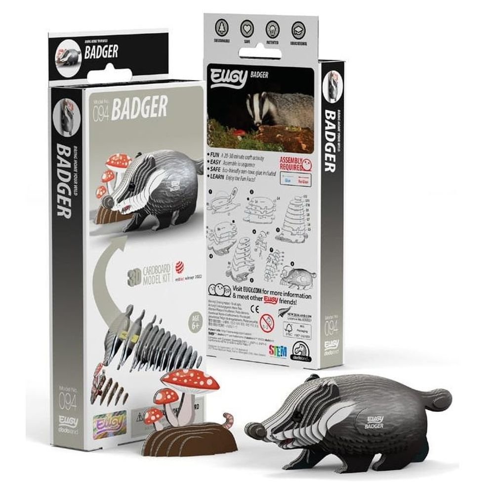 Eugy zaprojektowane w Nowej Zelandii są wykonane z przyjaznego dla środowiska kartonu pochodzącego z recyklingu i farby na bazie ryżu. Zestaw zawiera 35 ponumerowanych elementów układanki, oczka, nietoksyczny klej oraz instrukcję do zbudowania figurki borsuka. Zbierz całą serię zwierząt, ptaków, dinozaurów i wiele innych. Dla dzieci w wieku 6 lat +.