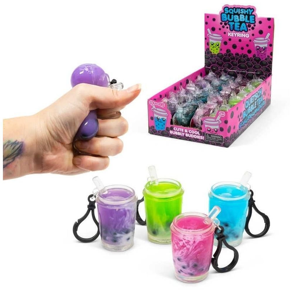 Uroczy brelok w stylu bubble tea, zawierający czarne kulki, które przypominają popularny napój. Można je łatwo ściskać i zgniatać.