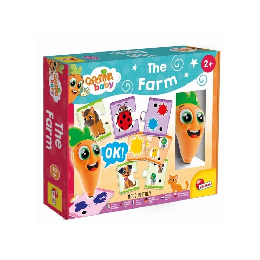 Interaktywny produkt do poznawania farmy przez zabawę w formie quizów. Dzieciom towarzyszy Carotina, która przy każdej poprawnej odpowiedzi radosnymi okrzykami zachęca dzieci do dalszej zabawy. Elementy wykonane z grubej i odpornej na ślinę tektury pozwalają najmłodszym lepiej poznać farmę dzięki logicznym skojarzeniom.