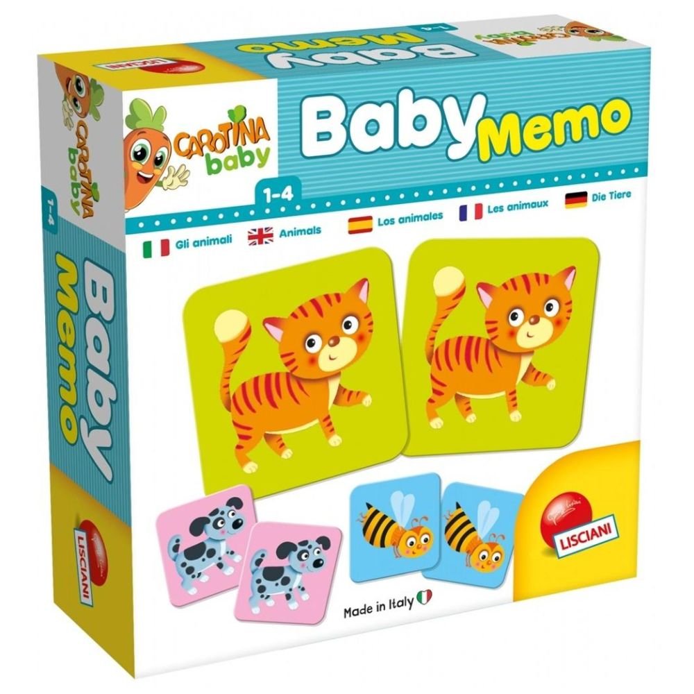 Gra memoria zwierzęta to gra, która rozwija pamięć. Zadaniem dzieci jest dopasowywanie do siebie par obrazków z kolorowymi zwierzętami. Seria Carotina Baby to seria Lisciani, skierowana do dzieci w wieku 0-3 lat.