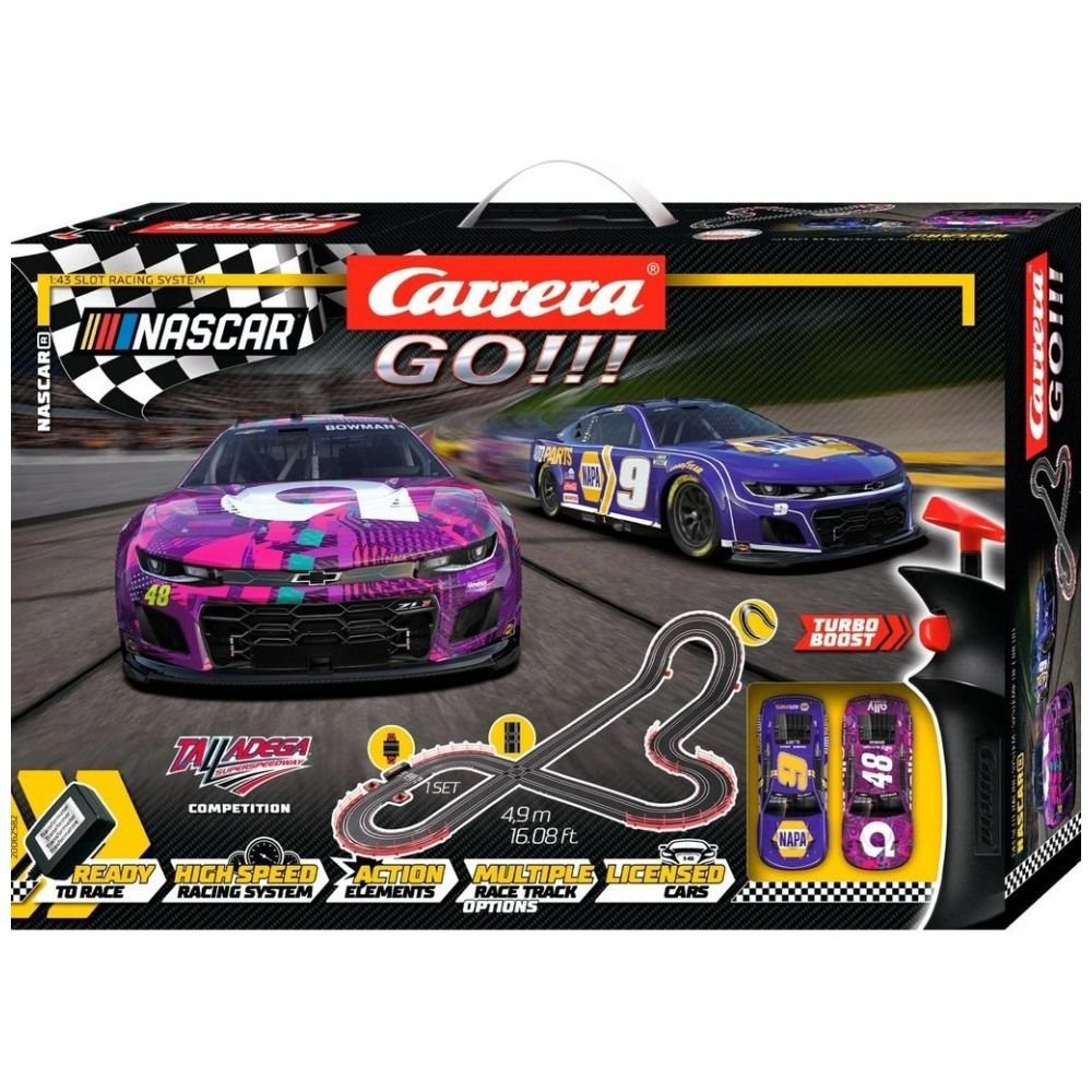 Sensacja NASCAR: Urodzona w USA Carrera GO!!! Zestaw NASCAR 4.9 zapewnia fanom w wieku od 4 lat ekscytujące wrażenia z wyścigów NASCAR w domu. Tor wyścigowy o długości 4,9 m/16,08 stóp z długimi prostymi i trudnymi zakrętami jest idealny do zapierających dech w piersiach bitew z dużą prędkością. Kierowcy ustawiają się w kolejce do dwóch niesamowitych samochodów znanego na całym świecie zespołu wyścigowego Hendrick Motorsports: NASCAR Camaro NextGen ZL1 Hendrick Motorsports, Chase Elliott, No.9 i NASCAR Camaro NextGen ZL1 Hendrick Motorsports, Alex Bowman, No.48 .