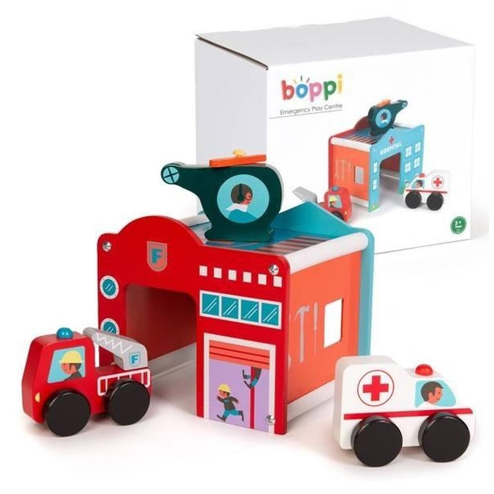 Drewniany zestaw od BOPPI to mnóstwo kreatywnej zabawy i odtwarzanie ról: strażaka, lekarza, pilota helikoptera, mechanika. Poręczny i wygodny domek to centrum ratownictwa 5 w 1. Mamy tutaj: szpital, remizę strażacką, zakład mechaniczny, stację benzynową oraz lądowisko dla helikopterów. W zestawie znajduje się również: helikopter, karetka oraz wóz strażacki z obrotową drabiną. Prawdziwa przyjemność zabawy dla najmłodszych miłośników tych zawodów:)