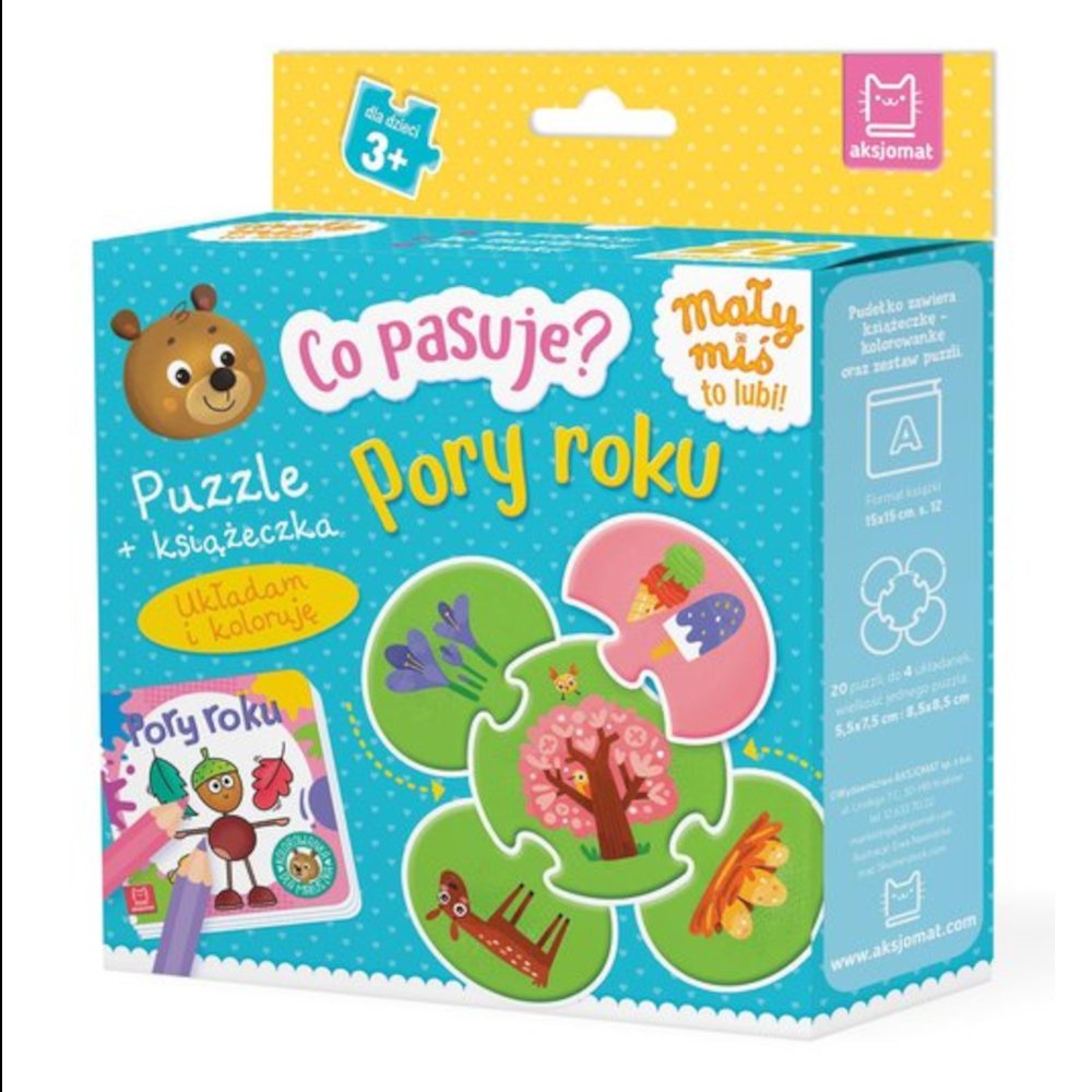 Puzzle służą do ułożenia 4 zestawów obrazków pasujących do danej pory roku. Zabawa polega na skojarzeniu pasujących do siebie rysunków i połączenia ich w całość. Dziecko nazywa pory roku oraz uczy się, jakie są ich charakterystyczne cechy. W książeczce znajdują się obrazki do pokolorowania – dziecko utrwala nazwy pór roku oraz ćwiczy rękę, kolorując. Dla dzieci powyżej 3. roku życia.