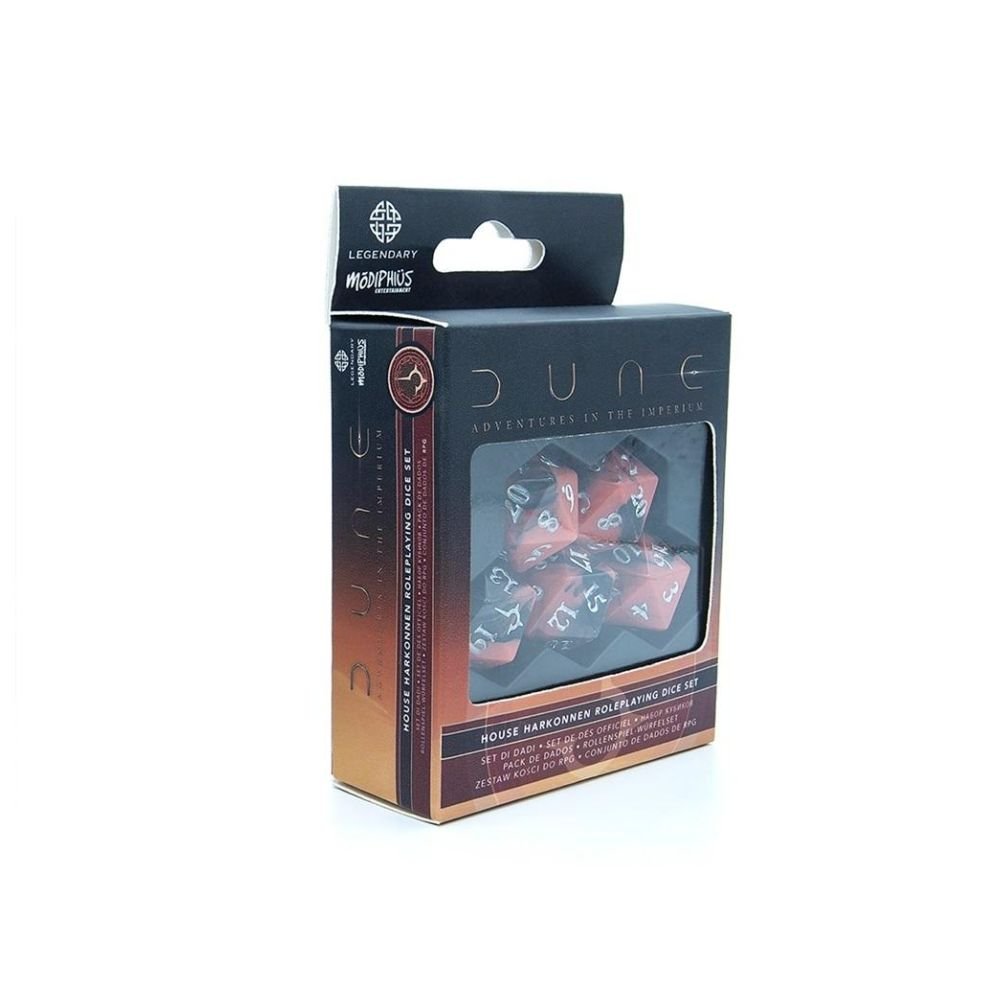 Zestaw zawiera pięć dwudziestościennych kości o krwawo-czerwonym kolorze (marbled) i srebrnej numeracji.