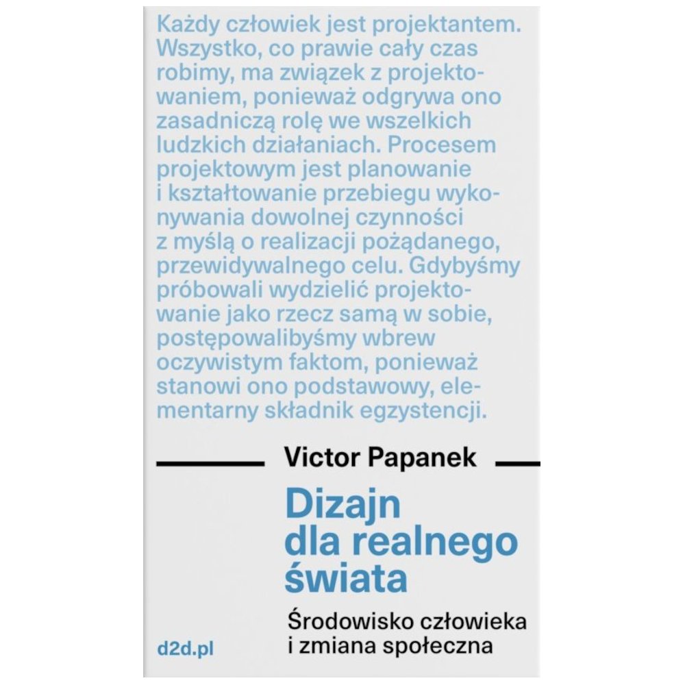 Dizajn dla realnego świata to najbardziej poczytna książka o projektowaniu i obowiązkowa lektura w wielu szkołach projektowania i architektury. Żywy i pouczający wykład Victora Papanka pokazuje, w jaki sposób projektowanie może stanowić wsparcie w zmaganiach z takimi współczesnymi bolączkami, jak zanieczyszczenie środowiska, przeludnienie, głód, marnotrawstwo zasobów. Autor prowadzi nas od "fetyszy dla społeczeństwa przesytu" do nowej ery projektowania moralnie i ekologicznie odpowiedzialnego.
