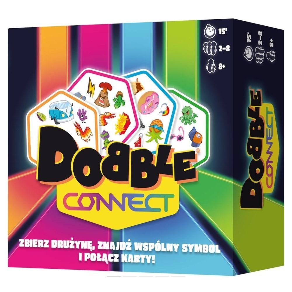 Dobble Connect to zupełnie nowa odsłona rodzinnej gry karcianej, w której ćwiczymy refleks i spostrzegawczość. Naszym celem jest ułożenie 4 kart w swoim kolorze tak, by tworzyły nieprzerwaną linię – poziomą, pionową lub na skos. Aby dołożyć kolejną kartę do wzoru, musimy znaleźć wspólny symbol, łączący ją z jedną z kart, do której chcemy ją przyłączyć. Kto pierwszy, ten lepszy!