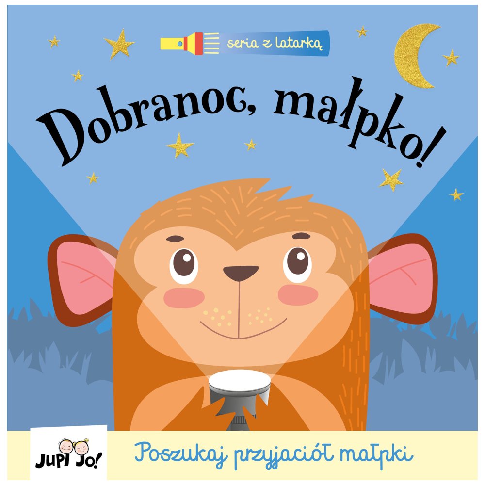 Małpka chce iść spać, ale zanim to zrobi, musi powiedzieć dobranoc innym zwierzętom. Pomożesz je znaleźć? Wyjmij znajdującą się w książce kartonową latarkę, weź ją do ręki, wsuń pod ciemną folię i rzuć światło na bohaterów książeczki. Słuchając rymowanej opowiastki, szukaj z małpką jej przyjaciół na kolejnych stronach. Czy udało ci się znaleźć wszystkie zwierzęta? Małpka usnęła, a ty?