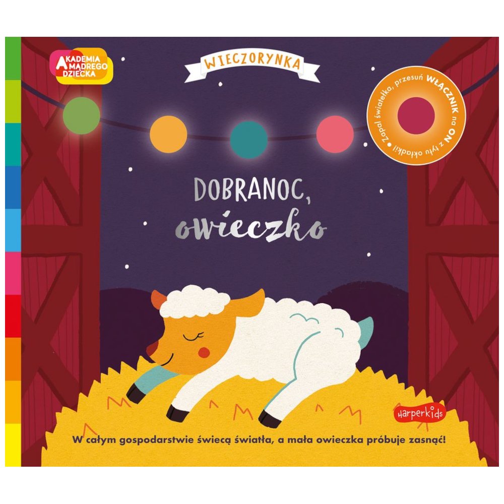 Książeczka ze światełkami Dobranoc owieczko z serii Wieczorynka opowiada o małej owieczce, która odwiedza wszystkie zwierzątka na farmie, by każdemu życzyć dobrej nocy przed spaniem. Owieczka mówi dobranoc konikom śpiącym na sianku, krówkom leżącym przy płocie, kurkom w kurniku oraz pieskom śpiącym w budzie by w końcu wrócić i zasnąć wtulona w mamę.