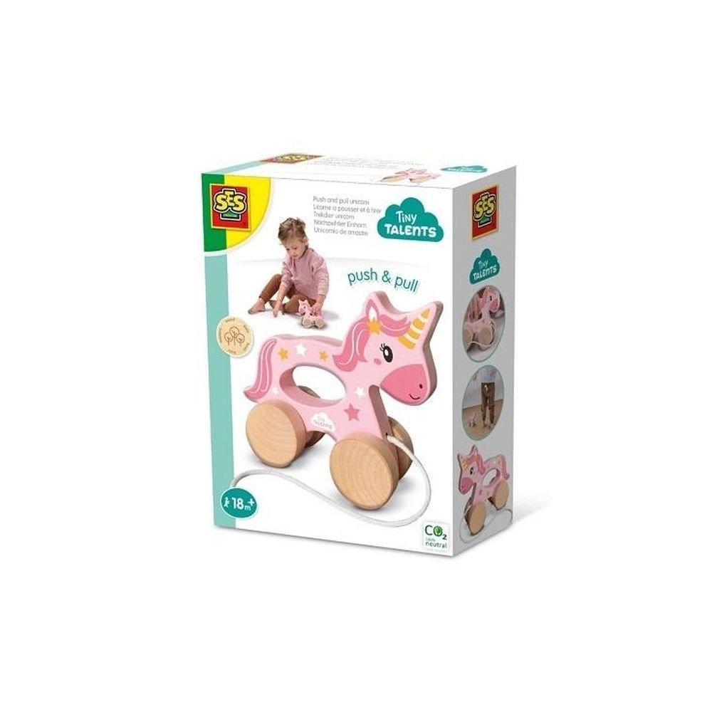 Piękny różowy jednorożec do ciągnięcia, wykonany z drewna i wyposażony w solidne koła do zabawy. Pchnij jednorożca, wykorzystując otwór jako uchwyt lub pociągnij za sznurek, aby jednorożec jechał z tyłu. Nowoczesny i uroczy wzór jednorożca, rozmiar dostosowany do dziecięcych dłoni.