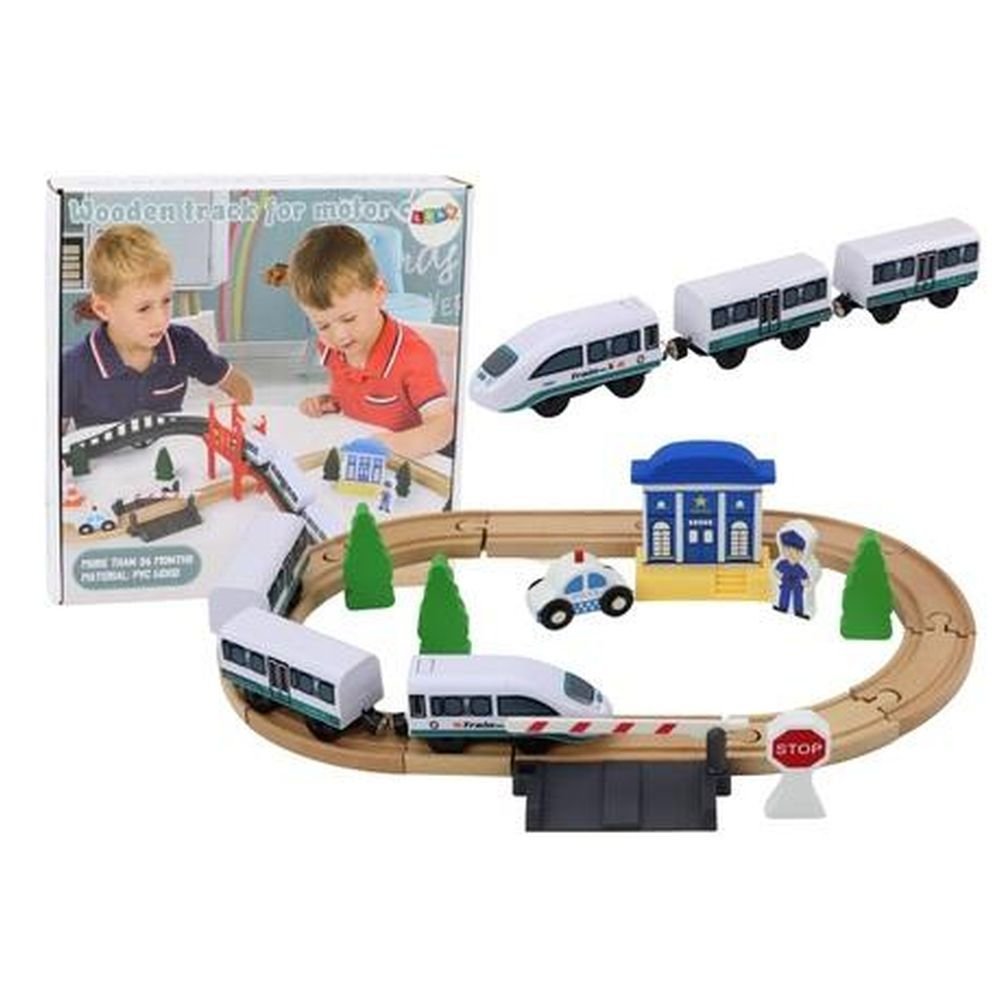 Drewniany Tor Kolejowy Pociąg Kolejka Tory Akcesoria Most Policja 3,2m Zestaw drewnianego toru dla pociągu to doskonała zabawka, która przenosi dzieci do świata kolejowych przygód i stymuluje ich wyobraźnię. Zaprojektowany z myślą o najmłodszych, zestaw ten zawiera wszystko, czego potrzeba do stworzenia bajkowego krajobrazu kolejowego. Kompletny zestaw drewnianych torów umożliwia zbudowanie różnorodnych tras dla pociągu o łącznej długości aż 320 cm, w tym mostu, tunelu oraz licznych zakrętów i prostych odcinków. Dzieci mogą kreatywnie aranżować tory, eksperymentować z układaniem tras i tworzyć swoje własne trasy kolejowe. W zestawie znajduje się także wiele akcesoriów dodających realizmu i głębi zabawie. Posterunek policji, radiowóz, figurka policjanta, drzewa oraz znaki drogowe pozwalają dzieciom odgrywać różnorodne scenariusze i tworzyć zróżnicowane historie związane z ruchem kolejowym. Drewniane elementy tory dla pociągu są solidne i trwałe, co gwarantuje długotrwałą zabawę oraz bezpieczeństwo podczas eksploracji. Zestaw ten nie tylko zapewnia rozrywkę, ale także rozwija kreatywność, wyobraźnię oraz umiejętności społeczne u dzieci. To doskonała zabawka dla każdego malucha, który marzy o podróży pociągiem przez bajkowy świat kolejowy. Zawartość zestawu: – lokomotywa – dwa wagony – most – drzewka – szlaban – policjant – znak stop – 17 drewnianych elementów drewnianego toru – oryginalne opakowanie Wymiary opakowania: 30 cm x 28 cm x 8 cm Długość toru zależna jest od jego złożenia. Pociąg zasilany jedną baterią 1.5V AA, która nie znajduje się w zestawie. Posiada certyfikat CE, ponadto jest zgodny z normą EN71. Zabawka przeznaczona jest dla dzieci powyżej 3 roku życia.