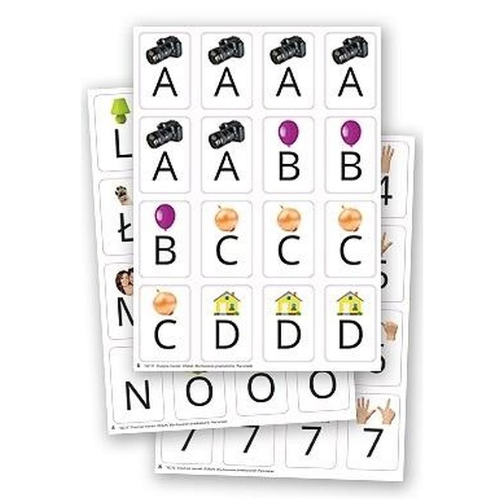 Zestaw kartoników z literami i obrazkami, których nazwy rozpoczynają się daną głoską, a także z liczbami przedstawionymi za pomocą palców dłoni i cyfr.