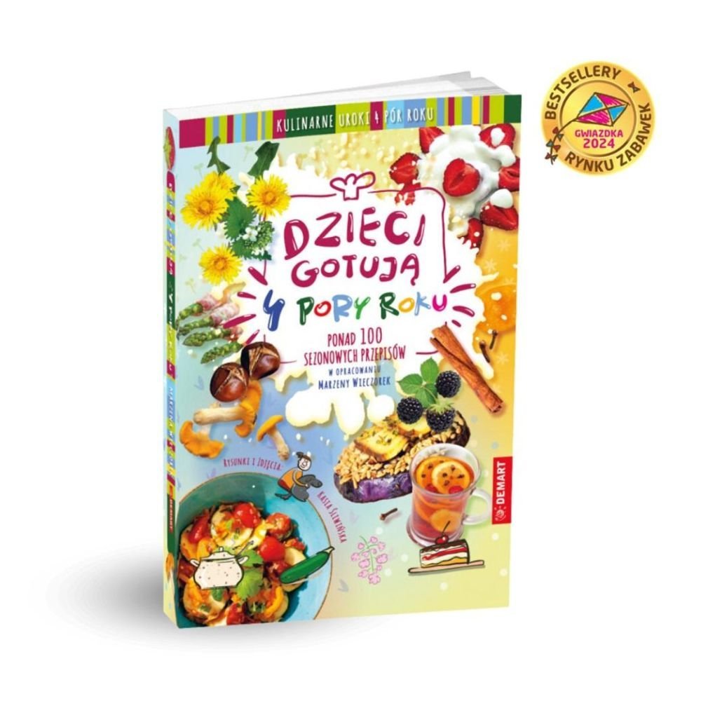W książce Dzieci gotują. 4 pory roku pokazujemy, że pora roku powinna mieć duży wpływ na to co jemy i dlaczego warto korzystać z sezonowych składników. Oczywiście, że smaki i zapachy takich potraw będą nie do podrobienia, ale Jest naprawdę wiele atutów krajowych produktów sezonowych. Najważniejszy z nich, to wyjątkowa wartość odżywcza skutek naturalnych warunków wzrostu i dojrzewania oraz krótkiego czasu od zbiorów do trafienia na talerze. Świeże owoce i warzywa sprawiają, że jesteśmy po prostu zdrowsi. Natomiast frykasy przywożone z daleka, w stanie niedojrzałym, są zabezpieczone różnymi chemikaliami przed psuciem i uszkodzeniami mechanicznymi. Zatem wiosną stawiajmy na nowalijki. Pamiętajmy o kiełkach, zielonych koktajlach na bazie świeżych liści (pietruszki, mięty, szpinaku) i sięgajmy po inne dary natury, takie jak chwasty! Latem obfitującym w owoce, w czasie upałów, serwujmy zupy na zimno, komponujmy swoje lody i sorbety, aromatyczne koktajle i lemoniady. Sięgajmy także po młode warzywa i świeże aromatyczne zioła. Jesień, to czas zbiorów owoców i warzyw, które trafiają do nas prosto z pola. Na straganach pysznią się grzyby i orzechy, w których oddziela się skórka od chrupiącego słodkawego wnętrza niebo w gębie! A charakter jesiennemu jadłospisowi nadaje dynia. A zimą jest czas na sycące ciepłe posiłki. W zastępstwie świeżych produktów postawmy na kiszonki. Korzystajmy z korzennych przypraw i cytrusów, na które sezon przypada w grudniu i styczniu. Zima pachnie także świątecznymi potrawami, piernikami, pieczonymi mięsami uzupełnionymi kunsztownymi sałatkami. Każdy może spróbować swoich sił w sezonowej kuchni z przepisami z tej książki. Są, i całkiem łatwe, i nieco trudniejsze, pracochłonne i niewymagające wiele czasu. Zachęcamy do eksperymentowania! Przy każdej potrawie znajdują się wskazówki, jak ją zmodyfikować.