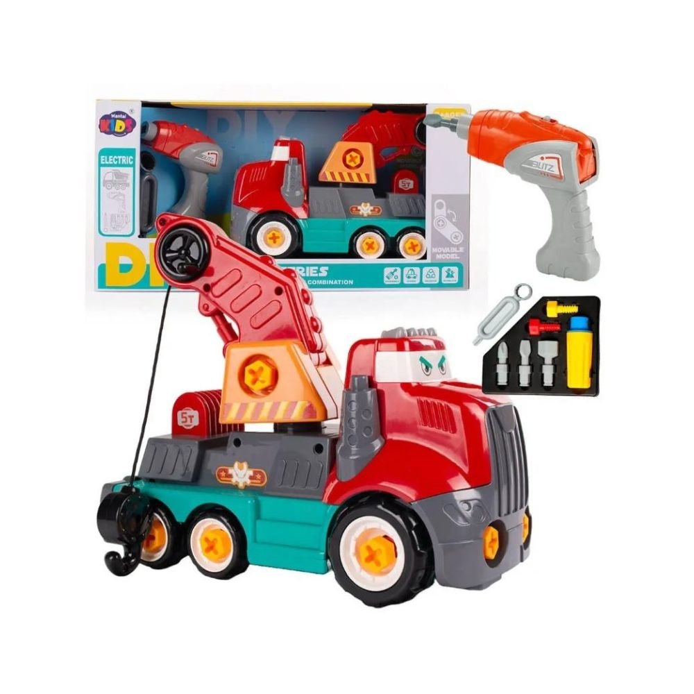 Kolorowy dźwig z ruchomym ramieniem to świetna zabawka dla dziecka, które uwielbia majsterkować – zabawka zajmie Twoją pociechę na wiele godzin. Do zabawki dołączono zestaw narzędzi – wkrętarkę, śrubokręt oraz wymienne końcówki stanowiące nieodłączny element tej zabawki, pozwalając dzieciom na samodzielne rozkręcanie i skręcanie pojazdu. Zabawka rozwijająca koordynację ruchową i wzrokową dziecka jest świetną formą spędzania czasu dla dziecka. Dźwig do samodzielnego skręcania to zabawka, która doskonale pobudzi kreatywność u dzieci. Model pojazdu wzorowany na prawdziwym dźwigu z mnóstwem elementów do samodzielnego skręcania i rozkręcania zachwyci każdego malucha! Ciekawe wykonanie, uśmiechnięta buźka – na pewno zadowolą każde dziecko.