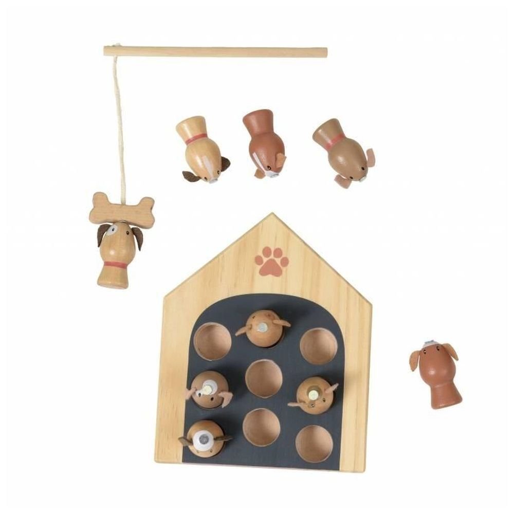 Klasyczna zabawa do ćwiczenia koordynacji ręka – oko. Gra wędkarska w bardzo stylowym opakowaniu – mini drewnianej budzie dla piesków. Dzieci mają za zadanie łowić pieski, używając do tego specjalnej wędki wyposażonej w mini kość – na magnes. Wystarczy przyciągnąć kostkę do pieska, aby go jak najszybciej schwycić.