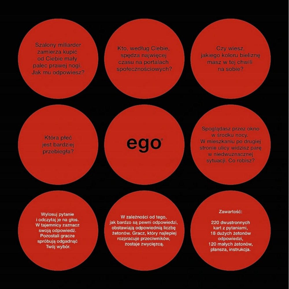 Ego to kultowa gra imprezowa. Wylosuj jedno z ponad 400 niebanalnych pytań i odczytaj je na głos. W tajemnicy wytypuj swoją odpowiedź. Pozostali gracze spróbują odgadnąć Twój wybór. W zależności od tego, jak bardzo są pewni odpowiedzi, obstawiają odpowiednią liczbę żetonów. Gracz, który najlepiej poznał swoich przyjaciół, zostaje zwycięzcą.