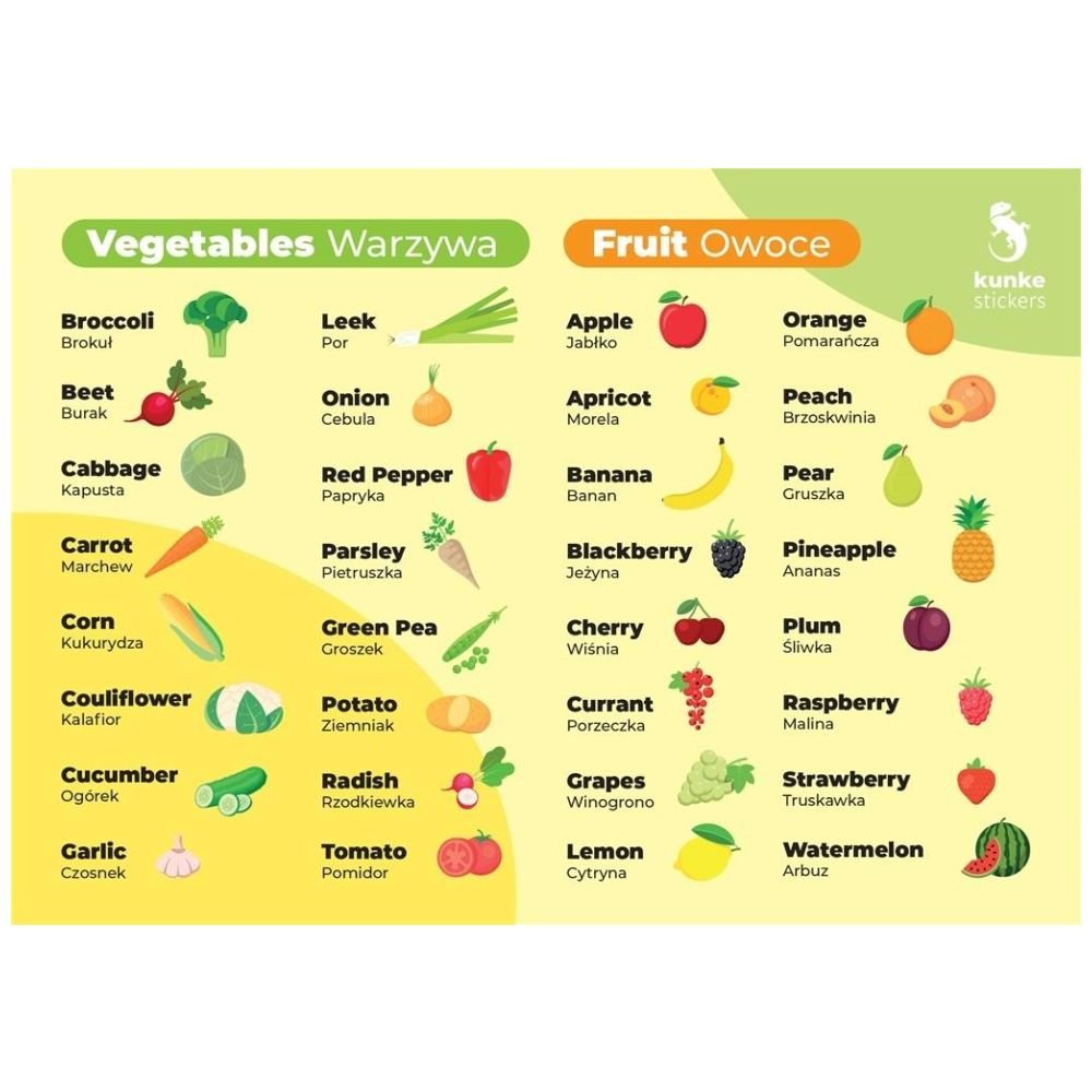 Poznaj naszą naklejkę elektrostatyczną Pomoce z Języka Angielskiego: Nauka Owoców i Warzyw, która sprawia, że nauka języka angielskiego staje się zabawą. Stworzona z myślą o najmłodszych, ale doskonała również dla starszych uczniów, ta naklejka jest niezastąpionym tematem edukacyjnym w domu, przedszkolu i szkole.
