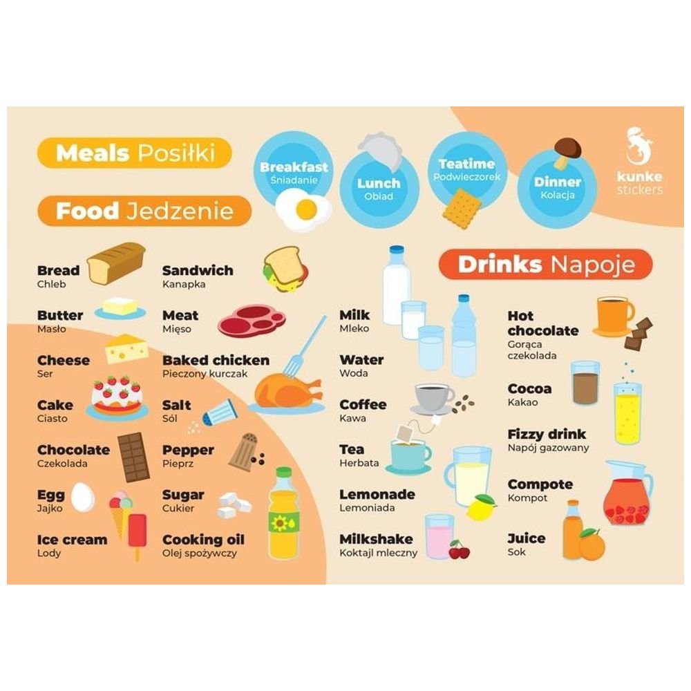 Odkryj innowacyjny sposób nauki języka angielskiego z naszą naklejką elektrostatyczną "Pomoce z Języka Angielskiego: Posiłki". Stworzona z myślą o dzieciach i dorosłych, stanowi idealne narzędzie edukacyjne do nauki nazw posiłków i jedzenia po angielsku. Doskonała do wykorzystania w przedszkolu, szkole i innych zajęciach edukacyjnych.