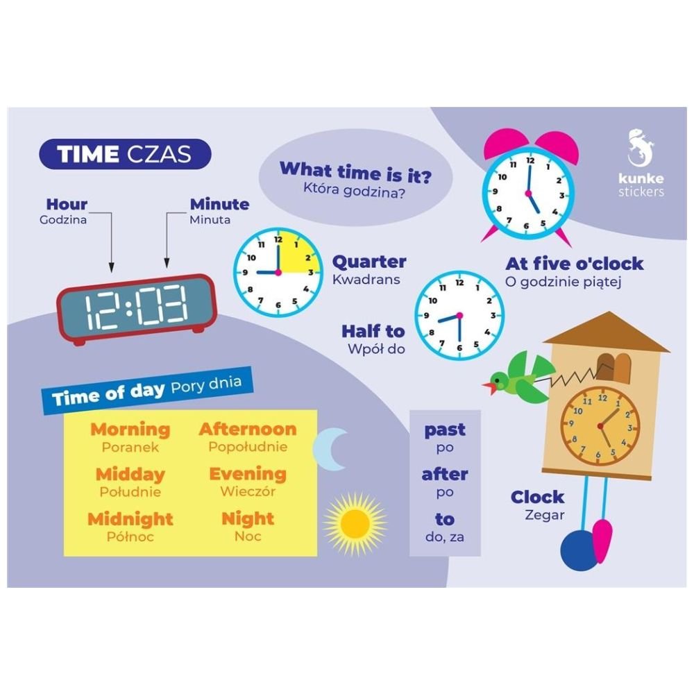 Wprowadź nowoczesne metody nauki języka angielskiego do swojego domu lub klasy z naszą naklejką elektrostatyczną "Pomoce z Języka Angielskiego: Nauka Czasu". Ta naklejka to idealne narzędzie, które pomaga w nauce wyrażania czasu po angielsku w sposób interaktywny. Doskonały zarówno dla dzieci, jak i dorosłych, znajdzie zastosowanie wszędzie tam, gdzie istotne jest nauczenie się języka obcego.