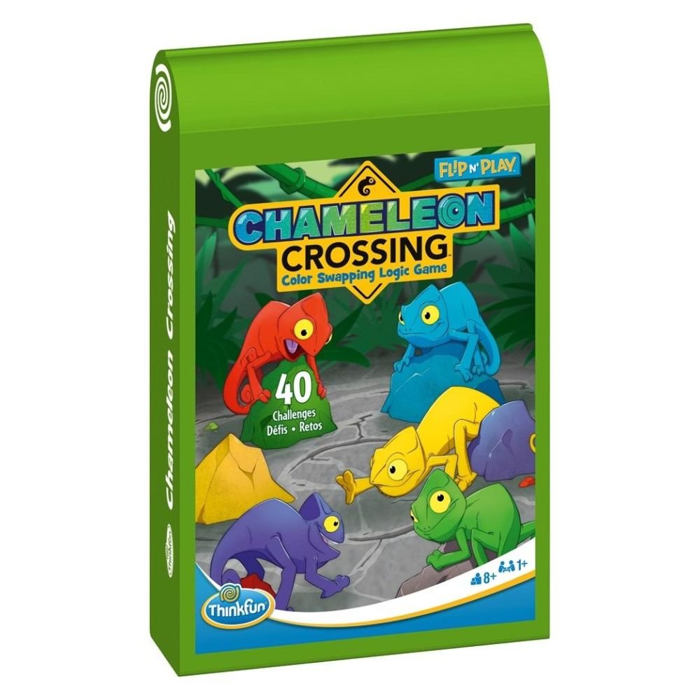 Podróżna gra logiczna Podróż Kameleonów idealna na wycieczki samochodowe, przeloty samolotem i wakacje. Te kameleony to dobra zabawa w różnych kolorach tęczy! Muszą znaleźć drogę do domu, do swojej skały! Przesuwaj kameleony wzdłuż białych ścieżek, aż wrócą do domu ze swojej pozycji wyjściowej. Dzięki 40 wyzwaniom ta gra podróżna oferuje godziny rozrywki podczas samodzielnej podróży do domu!
