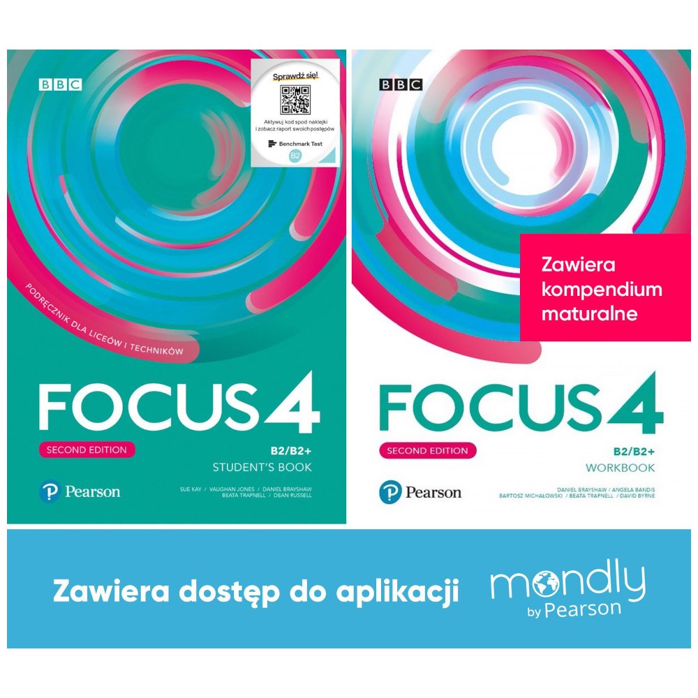 Komplet książek do nauki angielskiego Focus Second Edition 4 to podręcznik i zeszyt ćwiczeń, które uzupełniając się wzajemnie, skupiają się na rozwijaniu wszystkich umiejętności językowych sprawdzanych podczas matury z języka angielskiego. Publikacje z serii Focus Second Edition to sprawdzone materiały do nauki języka angielskiego zgodnie z podstawą programową. W skład kompletu wchodzi kod dostępowy do platformy MondlyWORKS. Platforma MondlyWORKS: daje pełny dostęp premium do 41 języków za pośrednictwem aplikacji Mondly by Pearson, wykorzystuje najnowocześniejsze technologie, takie jak chatboty, rozpoznawanie mowy i AI, udostępnia dodatkowe ćwiczenia w trybie "Hands free", symulującym prawdziwe rozmowy z nativespeakerami, które rozwijają u uczniów umiejętność mówienia w obcym języku, dzięki elementom grywalizacji i dostępu do ogólnych rankingów, daje uczniom możliwość konkurowania ze znajomymi i podejmowania wyzwań, daje dostęp do modułów z ponad 40 tematami, które wzbogacą lekcje przeprowadzane w klasie, jest dostępna na wszystkich urządzeniach: komputerach, telefonach i tabletach oraz łatwo integruje się z istniejącym programem nauczania, wspiera uczniów potrzebujących dodatkowych zadań, które nie wymagają wcześniejszego przygotowania, a ich wyniki pojawiają się automatycznie w aplikacji, w prosty sposób monitoruje aktywność i postępy uczniów. Każdy rozdział w podręczniku Focus 4 Second Edition to materiały do nauki wszystkich kompetencji językowych, które są sprawdzane podczas matury z języka angielskiego. Podręcznik zawiera różnorodne materiały ćwiczeniowe, a także kod dostępu do Digital Resources i Interactive eBook, czyli interaktywnej wersji podręcznika z ćwiczeniami online. Focus 4 Second Edition zeszyt ćwiczeń to nowa edycja stworzona dla liceów i techników przez wydawnictwo Pearson w 2020 roku. W zeszycie ćwiczeń Focus 4 Second Edition znajdziesz arkusze pracy z różnorodnymi ćwiczeniami, które pozwolą utrwalić wiedzę z podręcznika. Publikacja została zaprojektowana w ten sposób, aby numery stron z zeszytu ćwiczeń i odpowiadającego mu podręcznika, pokrywały się.
