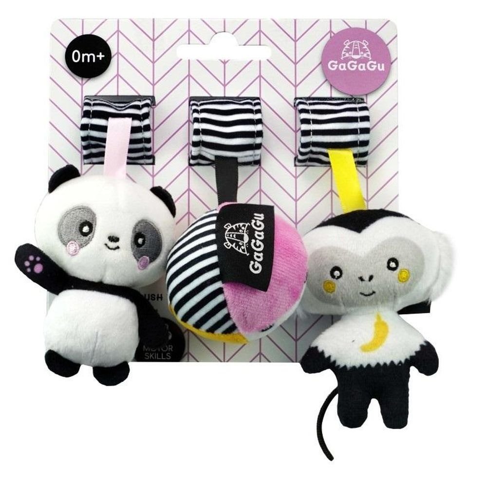 Wisząca pluszowa zabawka GaGaGu ma kontrastujące kolory i wzory, które stymulują wzrok dziecka. Pluszowe elementy małpka, panda i piłka oraz wstążki zachęcają dzieci do ich chwytania i wspierają tzw.