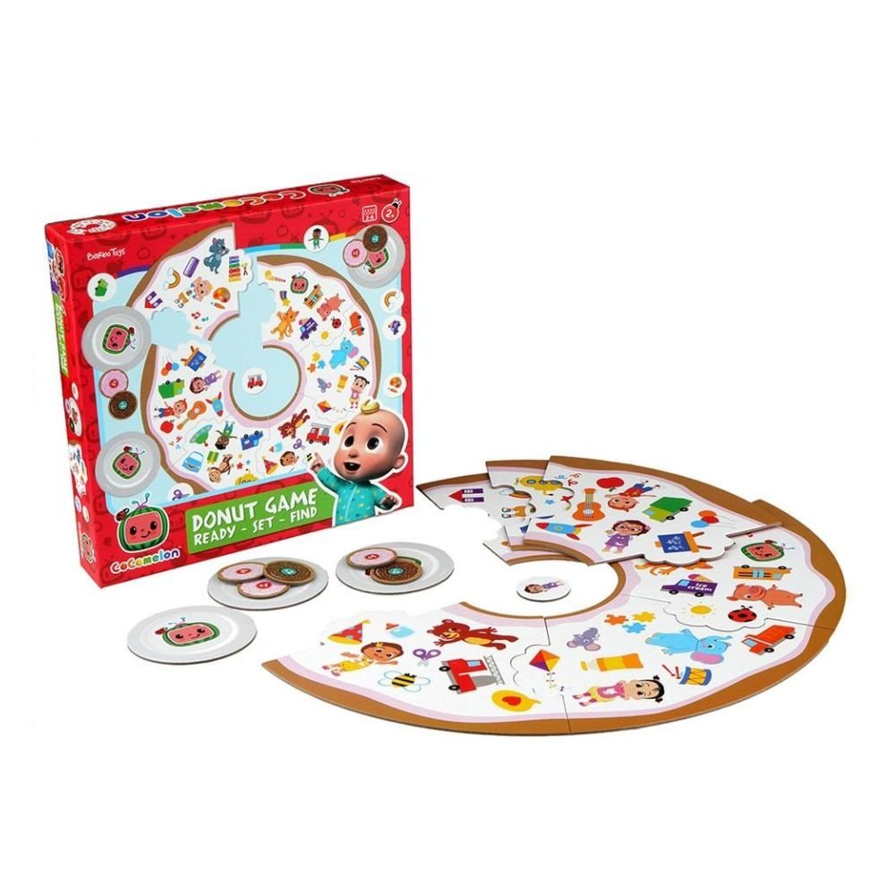 Puzzle, Gra Planszowa, Cocomelon, Pączki, 64 el. Fantastyczna gra planszowa dla 2-6 osób. Polega na odnajdowaniu pączków / żetonów tekturowych/ ze znanymi postaciami i przedmiotami z bajki Cocomelon, umieszczaniu ich na talerzyku, a następnie na planszy.