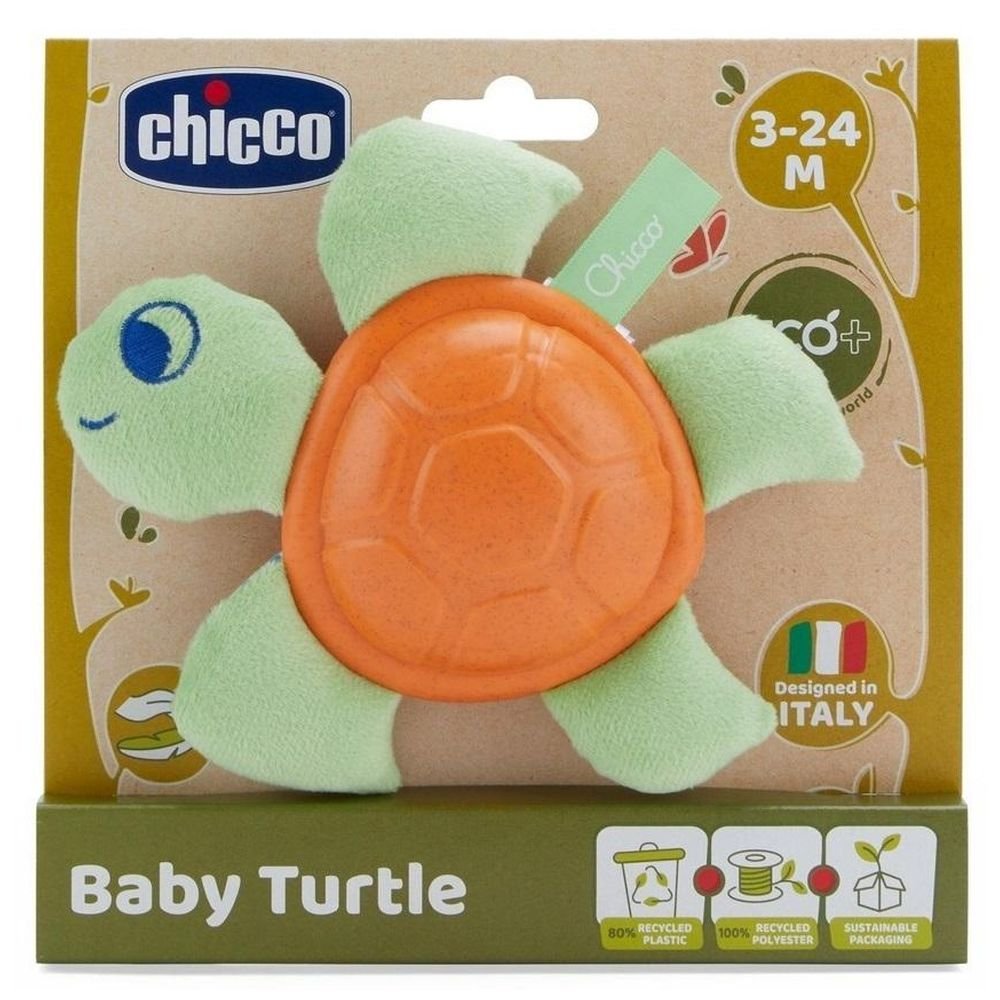 Niezywkle lekka grzechotka z postacią żółwia wykonane zarówno z recyklingowanych tekstyliów, jak i recyklingowanego plastiku.