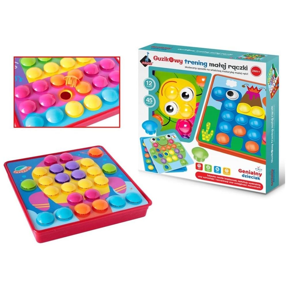 Ta wspaniała zabawka nauczy twoje dziecko, kształtów i kolorów. Guzikowy Trening rozwija wyobraźnię, oraz myślenie przestrzenne, które jest tak ważne w rozwoju każdego dziecka.Układanka guziczki to zabawka rozwijająca kreatywność małych dzieci, kształtująca wyobraźnię, ucząca wytrwałości i koncentracji oraz umiejętności manualnych.Układanka stymuluje motorykę małej ręki – sprawność dłoni i paluszków. Zestaw zawiera wygodne pudełko do przechowywania, aż 45 kolorowych guzików i 12 różnych wymiennych plansz do umieszczenia na specjalnym pudełku z dziurkami, na których układamy guziczki.Żywe kolory oraz różnorodność obrazków zachęca dziecko do zabawy i uczy nazywania i rozpoznawania kolorów.