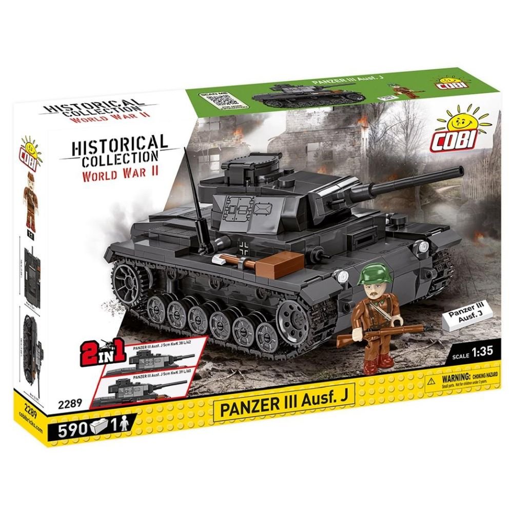 Panzer III Ausf. J Historical Collection World War II 590 klocków 1 figurka skala 1:35 Grupa wiekowa: 8+ Panzerkampfwagen III to niemiecki czołg średni z okresu II wojny światowej. Był najbardziej dynamicznie rozwijanym modelem służącym w armii III Rzeszy. W latach 1937-1943 powstało wiele jego wersji. Udane podwozie posłużyło jako baza do produkcji innych pojazdów militarnych. Była to bardzo dobra konstrukcja, wykorzystywana do samego końca wojny. Załoga liczyła 5 osób. Czołg uczestniczył w działaniach wojennych na wszystkich frontach europejskich oraz w Afryce Północnej. Tym razem przygotowaliśmy model z myślą o działaniach na froncie wschodnim drugiej wojny światowej. Armia węgierska czynnie wspierała wojska niemieckie na wschodzie, stąd też w zestawie obok modelu czołgu znajduje się starannie opracowana figurka węgierskiego żołnierza, który ma na wyposażeniu dwukolorowy karabin, hełm oraz furażerkę z nadrukami. Zupełnie nowy model czołgu stworzony z klocków konstrukcyjnych COBI posiada wiele ruchomych elementów takich jak: otwierany właz, obrotowa wieża, ruchoma lufa działa, czy obracające się koła i gąsienice! Na uwagę zasługuje opcja zbudowania dwóch wersji działa (2in1). Dodatkowe elementy umożliwiają budowniczemu wybór pomiędzy długo i krótkolufową wersją czołgu! Duża ilość szczegółowych nadruków odzwierciedla ważne detale pojazdu! Klapę serwisową na tyle pojazdu można podnieść, aby zobaczyć odwzorowany z klocków silnik. Zaletą zestawu jest także bardzo solidna konstrukcja, która wiernie odzwierciedla oryginalne kształty swego historycznego pierwowzoru. Model znakomicie sprawdza się jako element kolekcji pasjonatów historii i broni pancernej. W zestawie znajdują się klockowy czołg, figurka węgierskiego żołnierza oraz tabliczka z nazwą modelu. 590 wysokiej jakości elementów, wyprodukowane w UE przez firmę z ponad 20-letnią tradycją, klocki spełniają normy bezpieczeństwa dotyczące produktów dla dzieci, w pełni kompatybilne z innymi markami klocków konstrukcyjnych, klocki z nadrukami nie odkształcają się i nie bledną w czasie zabawy czy pod wpływem temperatury, czytelna i intuicyjna instrukcja oparta na rysunkach i ikonach, 1 figurka (żołnierz węgierski), dwa działa do wyboru (krótkie i długie) Wymiary modelu (dł x wys): 18 cm (7.9) x 8 cm (3.15)