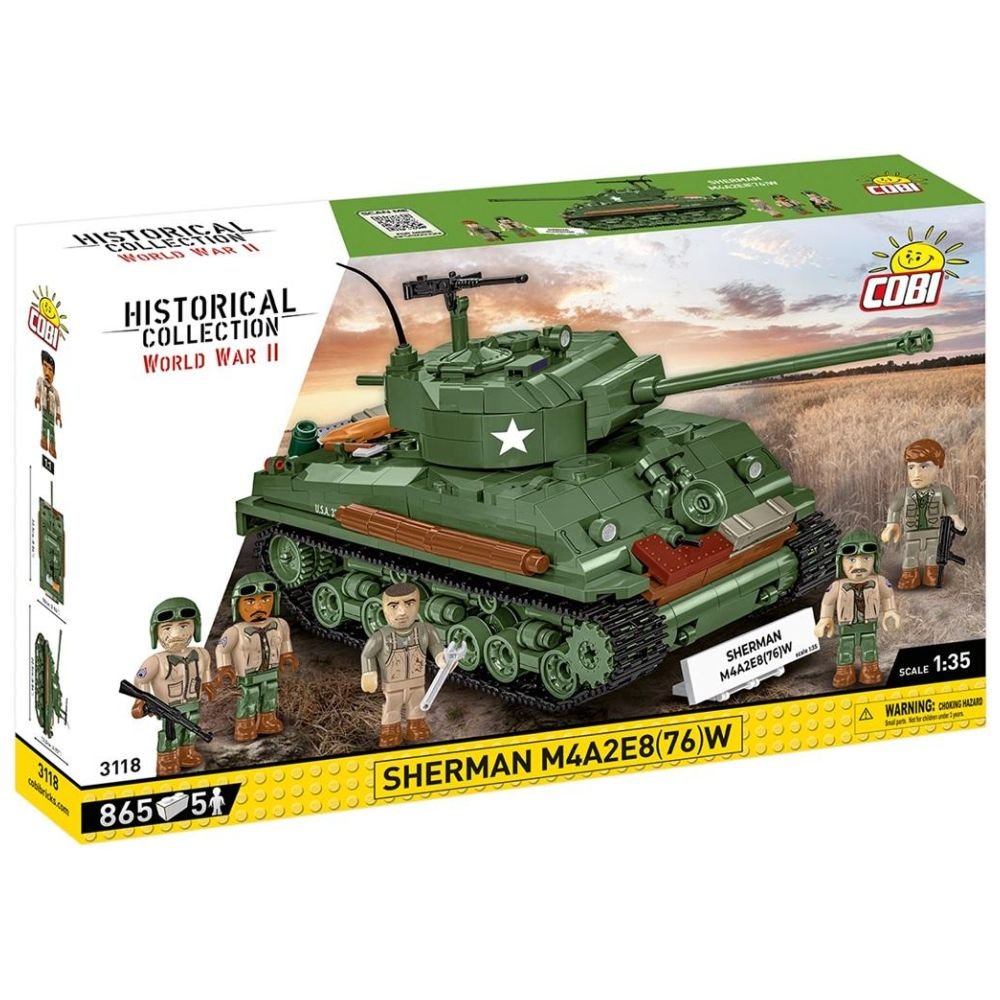 COBI-3118 SHERMAN M4A2E8(76)W Historical Collection WORLD WAR II 865 klocków 5 figurek Grupa Wiekowa 10+ Skala: 1:35 Zbuduj kultowy amerykański czołg z pełną 5-osobową załogą! M4A2E8 Sherman, znany również jako "Easy Eight," to amerykańska wersja czołgu średniego M4 Sherman, wprowadzona pod koniec II wojny światowej. Wyposażony był w lepsze zawieszenie HVSS (Horizontal Volute Spring Suspension) oraz długolufową armatę kalibru 76 mm, co poprawiło stabilność i celność pojazdu. Dzięki lepszemu opancerzeniu i mobilności ""Easy Eight"" był bardziej skuteczny w walce przeciwko niemieckim czołgom średnim, a jego prosta konstrukcja ułatwiała produkcję i naprawy. Klockowy model wyjątkowego Shermana został opracowany w skali 1:35 i uzupełnia kolekcję kultowych pojazdów wydawanych w ramach Kolekcji Historycznej poświęconej drugiej wojnie światowej. Świetnie odwzorowany z 865 klocków model posiada działającą trakcję gąsienicową. Możesz swobodnie nim jeździć po podłodze i obserwować pracę gąsienic! Poruszaj wieżą w zakresie 360 stopni i obierz cel ustawiając armatę na wybranej wysokości. Na wieży znajduje się karabin maszynowy Browning, który jest dokładną kopią wojennego oryginału. Czołg wygląda bardzo atrakcyjnie dzięki wielu akcesoriom przyczepionym do kadłuba. Widać, że spędził już na froncie dłuższy czas, a dołączona do niego 5-osobowa załoga to prawdziwi weterani, o których z pewnością można by nakręcić niejeden film! Szczegółowo odwzorowane figurki posiadają mnóstwo detali i z pewnością będą bardzo cennym elementem kolekcji! Zapewniamy, że każda z nich ma swój własny styl i charakter. Klockowa tabliczka z nadrukowaną nazwą czołgu pomoże Ci jeszcze lepiej wyeksponować model. Buduj historię, klocek po klocku! -865 wysokiej jakości elementów, -wyprodukowane w UE przez firmę z ponad 35-letnią tradycją, -spełniają normy bezpieczeństwa dotyczące produktów dla dzieci, -w pełni kompatybilne z innymi markami klocków konstrukcyjnych, -zastosowano tylko trwałe nadruki bez użycia naklejek, -czytelna i intuicyjna instrukcja oparta na rysunkach i ikonach, -5 figurek, pełna załoga! -tabliczka z nazwą -akcesoria do figurek -skala 1:35, -wymiary modelu (dł x szer x wys): 22,5 cm (8.85") x 10 cm (3.93") x 12,5 cm (4.92)