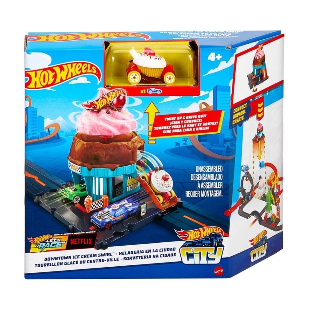 Szykuj się na jeszcze większą porcję zabawy z zestawem Hot Wheels City Rajdowa lodziarnia. Ten zestaw w kształcie deseru lodowego ma zakręconą windę, którą pojazdy mogą wjechać na górę. A po rozłożeniu rampy autka ruszają w dół ku kolejnym przygodom. Zestaw zawiera 1 pojazd Hot Wheels(R) i łączy się z innymi zestawami. Dodatkowe zestawy sprzedawane oddzielnie, zależnie od dostępności. Kolory i elementy dekoracyjne mogą się różnić.
