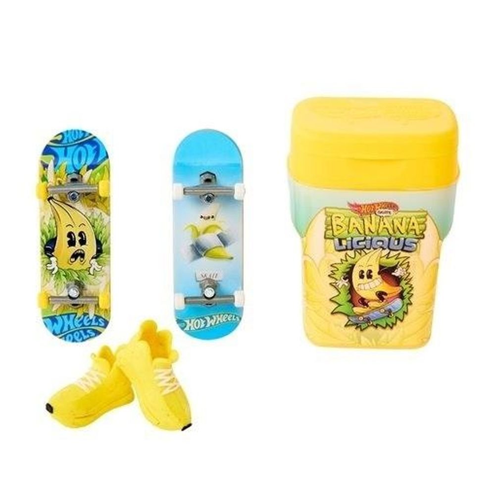 Skatebox od Hot Wheels Skate w kształcie pojemnika na gumy do żucia zawiera dwie deskorolki do jazdy palcami i parę butów deskorolkowych na palce i pozwala zabrać odjazdową zabawę ze sobą, gdziekolwiek chcesz. Otwórz pudełko ozdobione wyczesanymi grafikami i zachwyć się zawartością. W środku znajdziesz 2 wyjątkowe deskorolki na palce i parę zdejmowanych butów deskorolkowych na palce pasujących stylem do desek. Dzięki wygodnemu pojemnikowi skateboardową zabawę możesz zabrać, gdziekolwiek chcesz. Do wyboru jest kilka zestawów fani będą chcieli zebrać je wszystkie. Sprzedawane oddzielnie, zależnie od dostępności. Kolory i elementy dekoracyjne mogą się różnić.