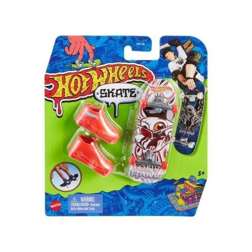 Hot Wheels(R) i legenda skateboardingu, Tony Hawk, połączyli siły, aby stworzyć epicką kolekcję deskorolek do jazdy palcami doskonałą do ćwiczenia nowych sztuczek i niesamowitych tricków. W każdym zestawie jest deskorolka Hot Wheels(R) do jazdy palcami oraz para stylowych zdejmowanych butów deskorolkowych, pomagających utrzymać palce na miejscu podczas rozgrzewających do czerwoności popisów. Nowicjusze mogą nabrać pewności siebie oraz lepiej wyczuć deskę i ruchy, a potem spróbować trudniejszych manewrów już bez butów na palce. Każda deska ma niepowtarzalny wzór, dzięki czemu fani będą chcieli zebrać je wszystkie. Sprzedawane oddzielnie, zależnie od dostępności. Kolory i elementy dekoracyjne mogą się różnić.