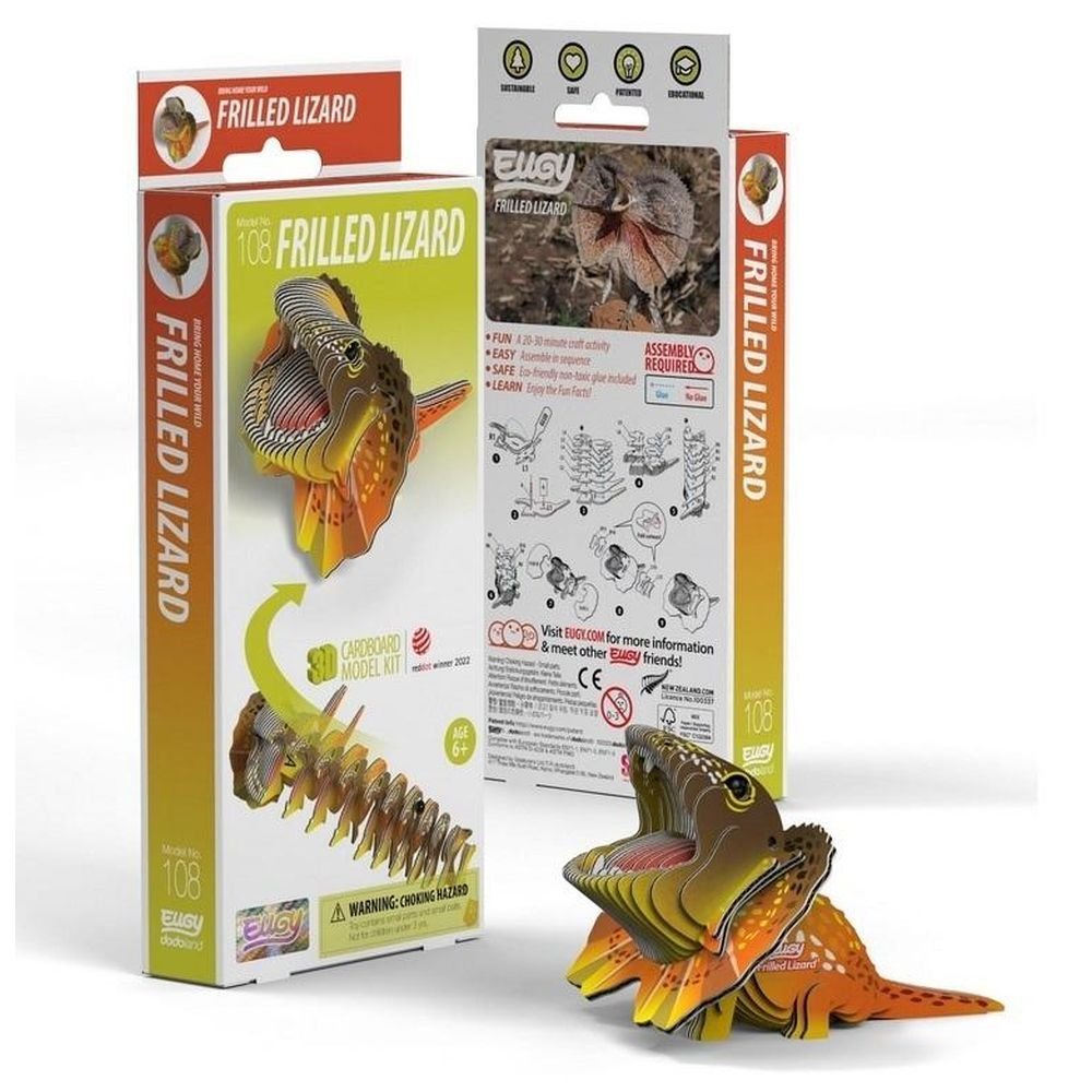Eugy zaprojektowane w Nowej Zelandii są wykonane z przyjaznego dla środowiska kartonu pochodzącego z recyklingu i farby na bazie ryżu. Zestaw zawiera 32 ponumerowane elementy układanki, oczka, nietoksyczny klej oraz instrukcję do zbudowania jaszczurki.