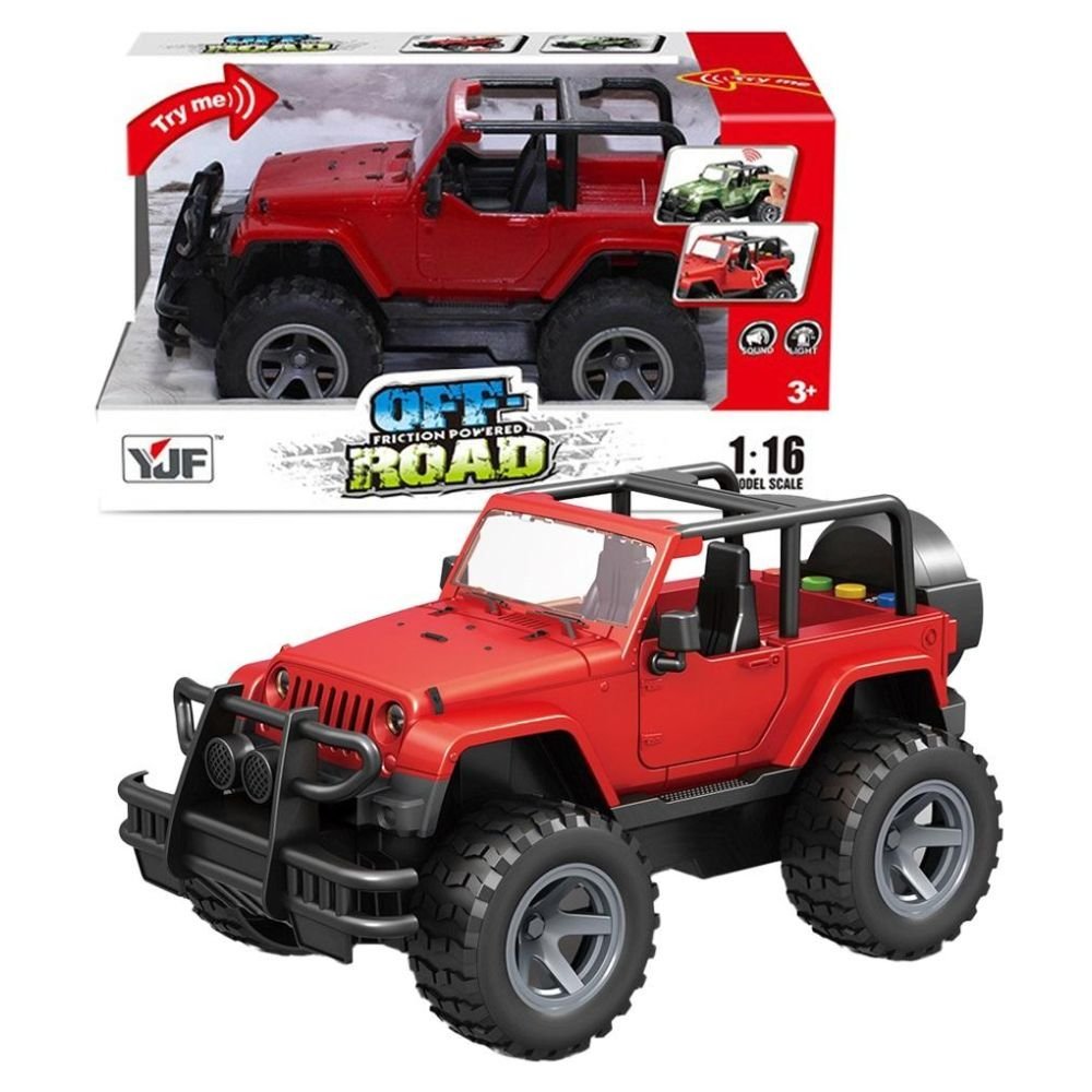 Czerwony jeep na baterie. Po naciśnięciu któregoś z czterech przycisków wydaje dźwięki. Światło. Baterie – 3xAG13 (dołączone).