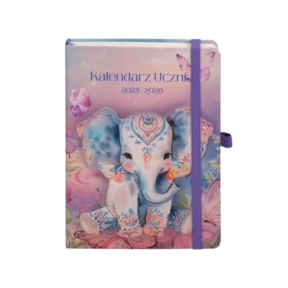 Wnętrze: tydzień na stronie Liczba stron: 180, Gramatura papieru: 80 g/cm2,Papier: chamois,Okładka: twarda, Pionowa gumka zamykająca,Zakres dat:wrzesień 2025 sierpień 2026, Dodatki szkolne:, Plan zajęć, Tabela ocen, Prace domowe, Sprawdziany, Zebrania z rodzicami,Wycieczki, Zajęcia pozalekcyjne, Wydatki, Lektury,Ważne wydarzenia oraz kolorowanki