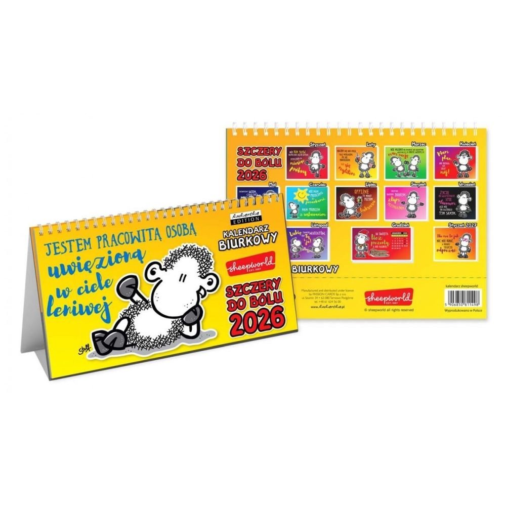 Kalendarz biurkowy 2026 Sheepworld Kalendarz na biurko na rok 2026 z serii ,,Szczery do bólu" Każdy miesiąc cieszy zabawną ilustracją owieczki oraz śmiesznymi hasłami. Kalendarz ma wymiary 21×12 cm Dodatkowe kalendarium na odwrocie z miejscem na notatki Styl: cytaty, nowoczesny, klasyczny, zdjęciowy Prezent: dodatkowe kalendarium styczeń 2027
