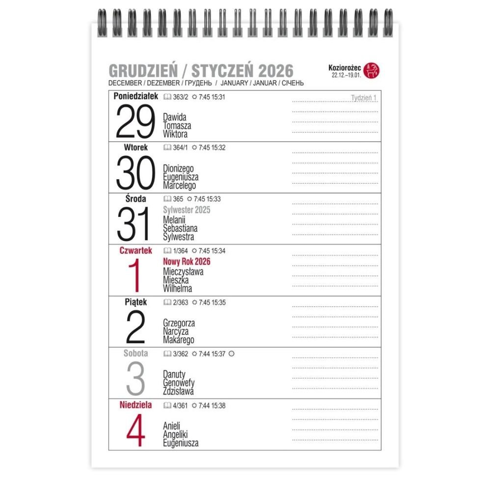 Kalendarz 2026 Biurkowy A5 TYGODNIOWY PIONOWY MINI. Oprawa czarna spirala na sztywnej podstawie kartonowej. Format 90/113mm. Papier offsetowy 80 gsm, okładka papier kredowy. 54 strony (układ tygodniowy ) + okładka. Kalendarz zawiera imieniny, nazwy świąt, numeracje tygodni, znaki zodiaku, wschody i zachody słońca. Dodatkowo nazwy miesiąca i dni tygodnia w języku Angielskim i Niemieckim. Kalendaria PL EN DE UE.