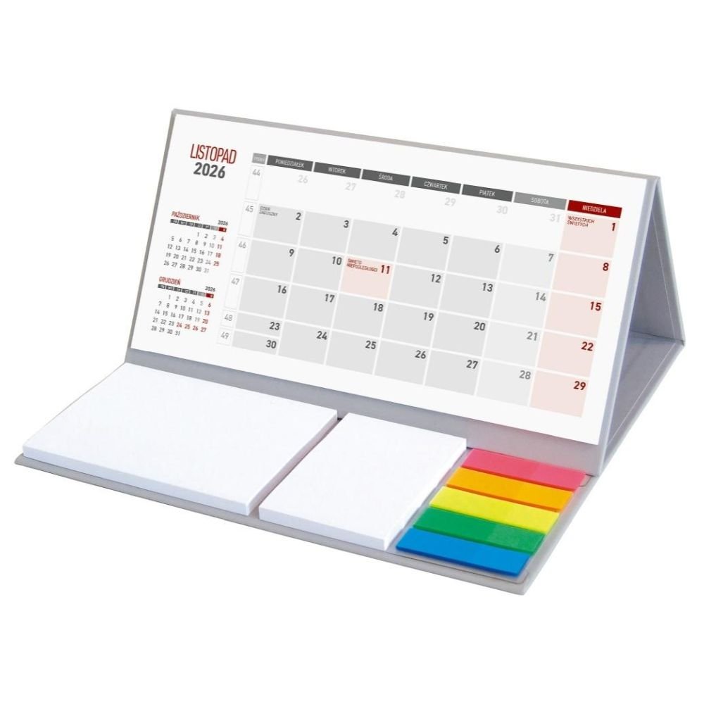 Wygodny kalendarz stojący na biurko z przejrzystym kalendarium w układzie miesięcznym z poręcznymi karteczkami samoprzylepnymi do notowania. Przydatny zwłaszcza w biurze. W kalendarzu zaznaczono święta.