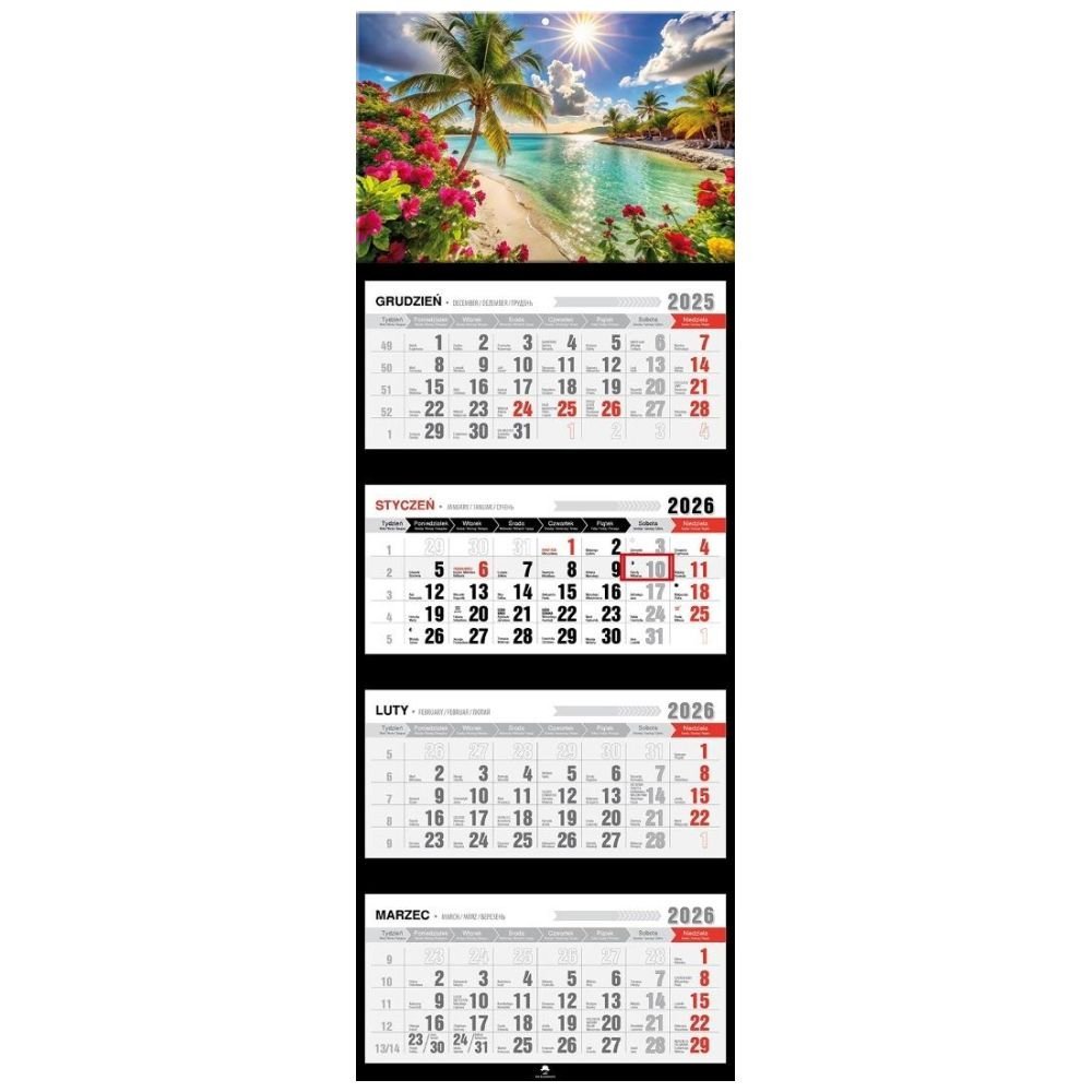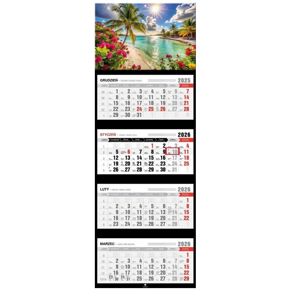 Kalendarz 2026 CZTERODZIELNY/ CZTEROMIESIĘCZNY /KWARTALNY PREMIUM Z WYPUKŁĄ GŁÓWKĄ. Format 315/890mm. Trzy komplety klasycznych kalendariów z przesuwnym okienkiem. Główka wypukła z otworem wierconym. Dodatkowo nazwy miesiąca i dni tygodnia w języku Ukraińskim, Angielskim i Niemieckim. Kalendarium dodatkowo zawiera fazy księżyca i znaki zodiaku. Dużo miejsca do notowania, czytelne duże litery i cyfry. Tematyka krajobrazy, pejzaże, zwierzęta, widoki, glamour, kawa. Nowoczesne i klasyczne wzornictwo, dopracowane wzory, czytelne kalendarium. Praktyczny i elegancki kalendarz który sprawdzi się zarówno w domu, biurze jak i innych pomieszczeniach.