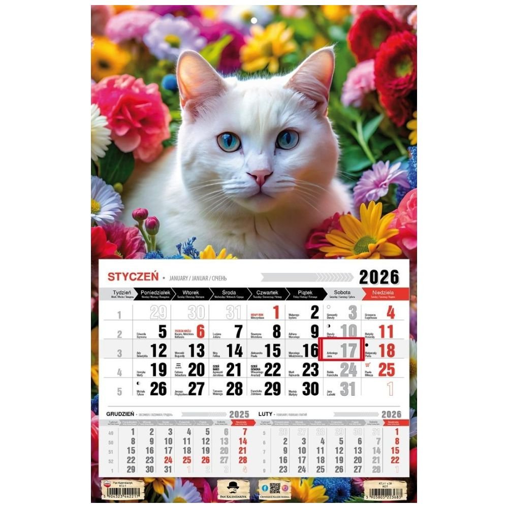 Kalendarz 2026 Trójdzielny JEDNODZIELNY. Format 315/480mm. Układ kalendariów jednodzielny z przesuwnym okienkiem. Główka z otworem wierconym. Dodatkowo nazwy miesiąca i dni tygodnia w języku Ukraińskim, Angielskim i Niemieckim. Kalendarium dodatkowo zawiera fazy księżyca i znaki zodiaku. Dużo miejsca do notowania, czytelne duże litery i cyfry.