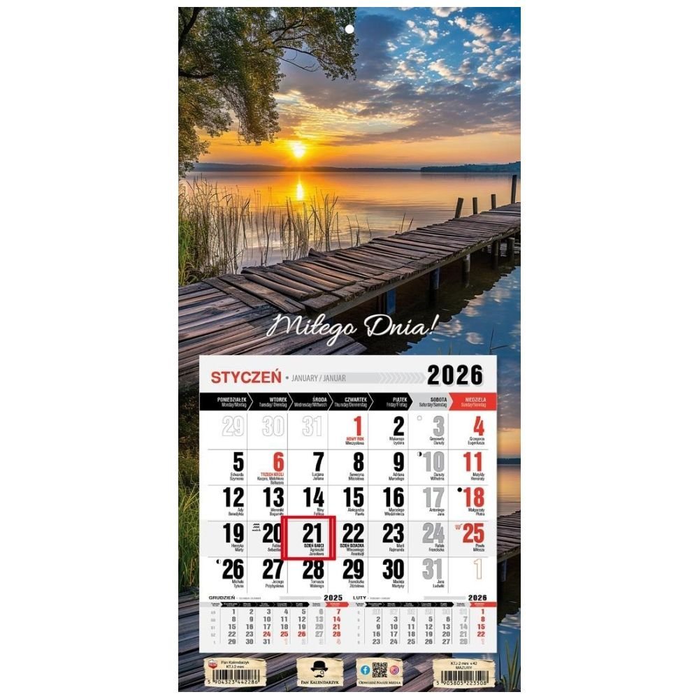 Kalendarz 2026 Trójdzielny JEDNODZIELNY MINI Z MAGNESEM. Format 230/460mm. Układ kalendariów jednodzielny z przesuwnym okienkiem. Główka z otworem wierconym oraz magnesem to doskonała propozycja do przyczepienia na lodówkę. Dodatkowo nazwy miesiąca i dni tygodnia w języku Ukraińskim, Angielskim i Niemieckim. Kalendarium dodatkowo zawiera fazy księżyca i znaki zodiaku. Dużo miejsca do notowania, czytelne duże litery i cyfry.
